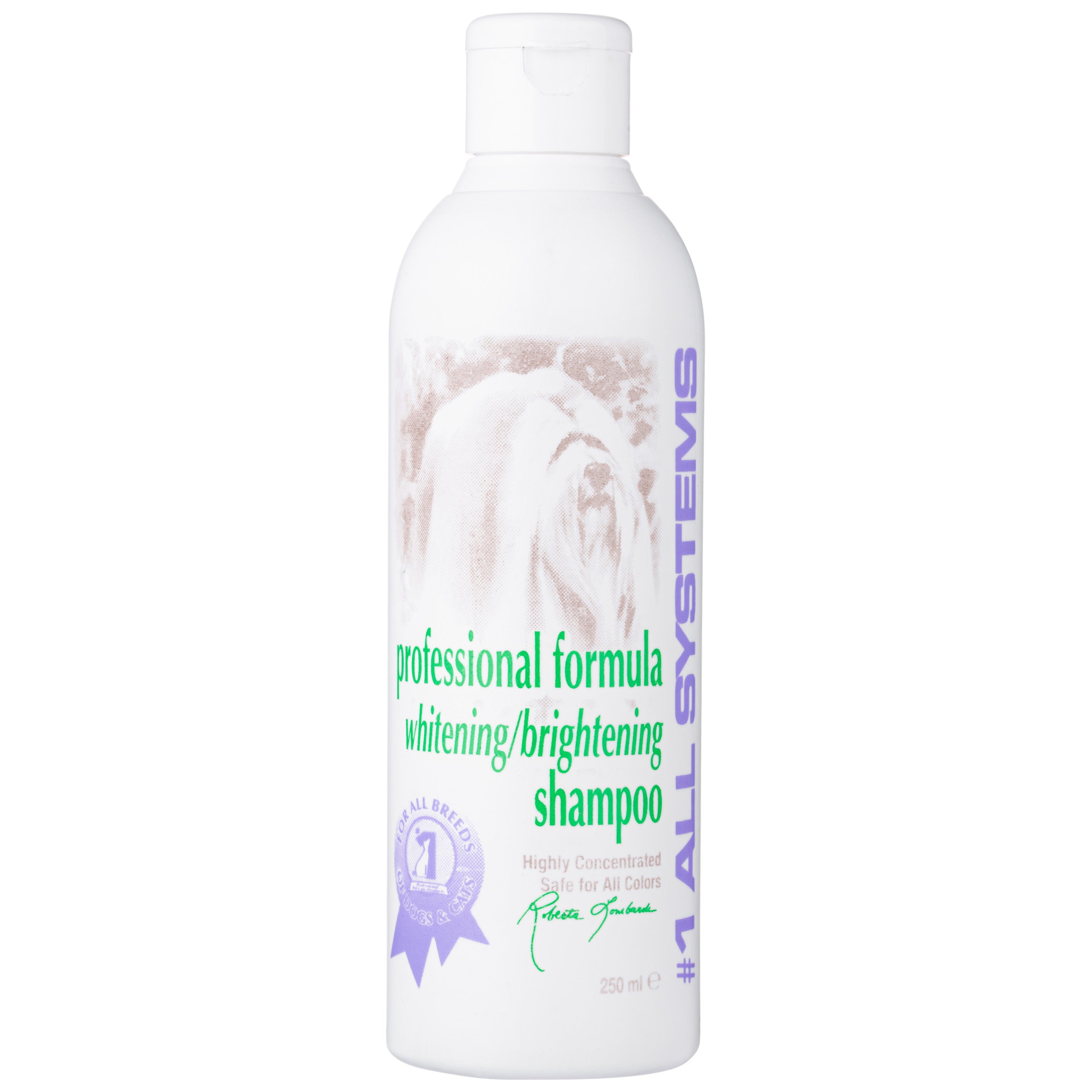 1 All Systems Professional Formula Whitening Shampoo is a concentrated shampoo for dogs and cats that removes discoloration and is safe for all coat colors.