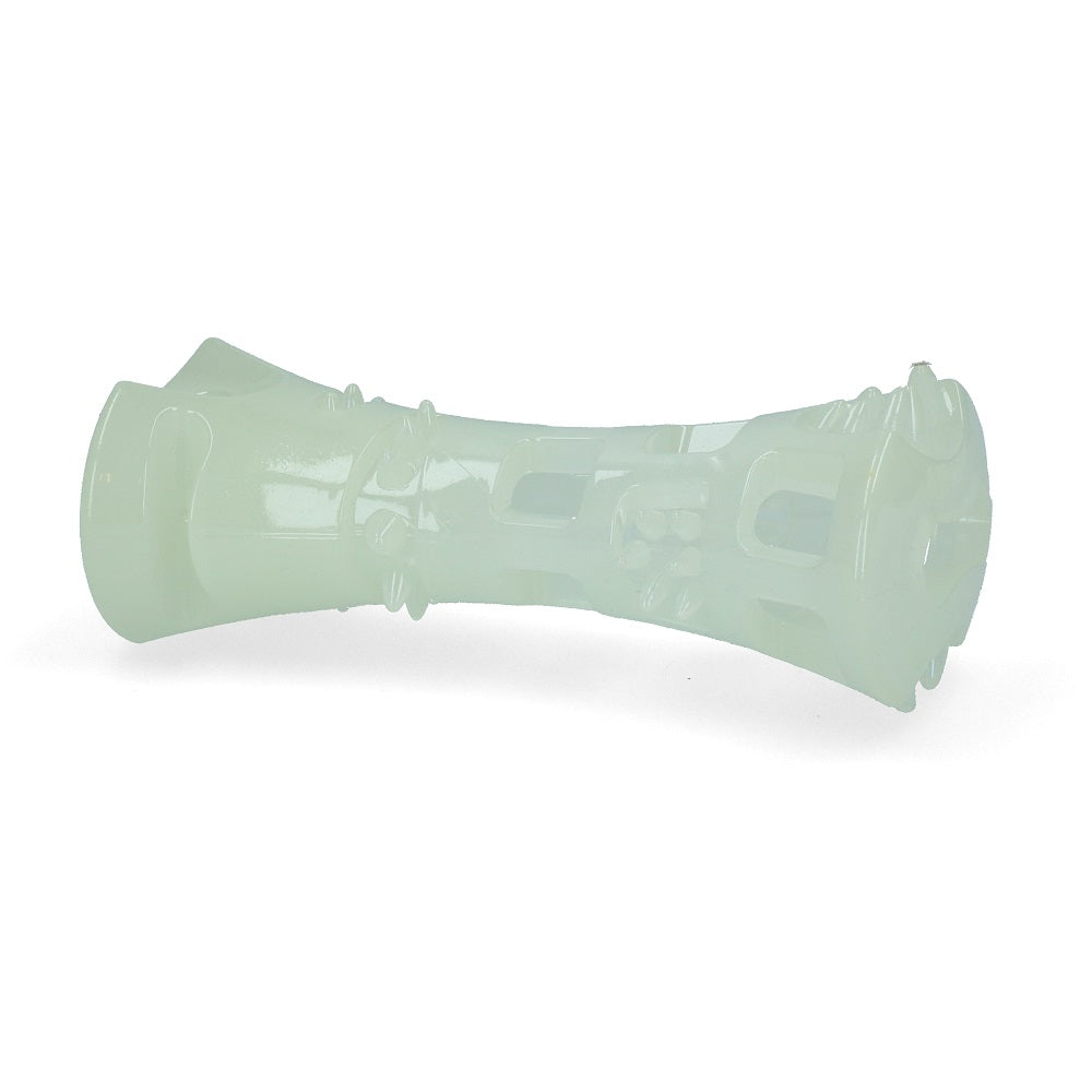 The 2 Glow Treat Bone of Its Own is a durable, fluorescent bone that you can fill with treats. It is the perfect toy for those who come home late from work or enjoy nighttime walks with their dogs. This glow-in-the-dark bone ensures you don't miss out on playtime with your beloved four-legged friend just because it's dark. The toy doesn't need batteries to be visible after dark or in bad weather. If left in the sun or under a lamp for 5 minutes, it will glow with a greenish light for about 20 minutes, allowing you to extend your evening walk and play without worrying about losing the toy in the grass.