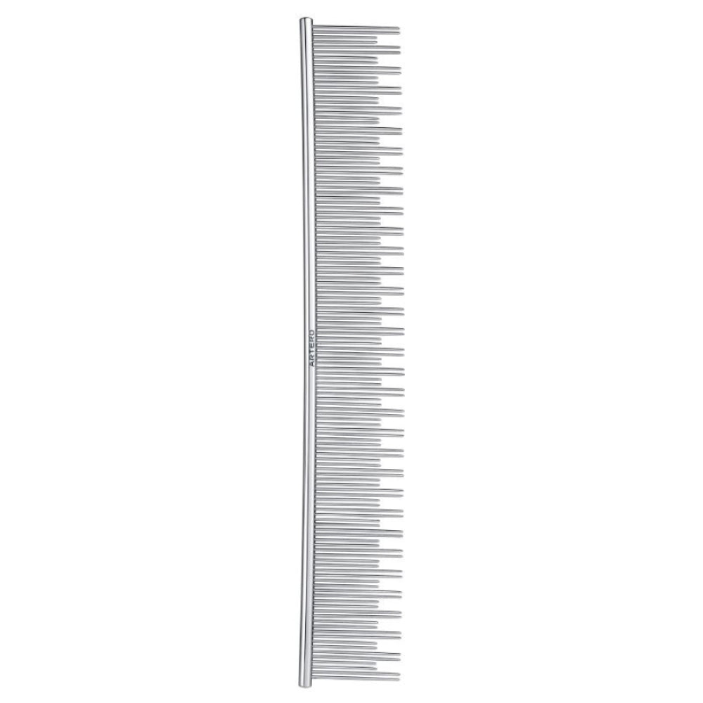 The Artero Bear Volume Comb Double Prong is a professional volumizing comb with 130 conically tipped teeth of variable length. This combination perfectly separates hair and then shapes it by lifting it upward. It can dramatically increase the volume of fine hair. This model is also helpful during shearing, helping to pull out individual strands and hold them in the correct position for an even cut. The rounded tips of the pins are gentle on the animal's skin, even sensitive and prone to irritation. The comb is made of metal that has undergone an eco-galvanization process, which prevents rust and contributes to the tool's functionality – it smooths the material's structure, making it glide smoothly through the coat. Unlike traditional methods, eco-galvanization generates significantly less waste and does not emit harmful substances into the environment in which we live together with our beloved pets. The comb's slim design makes it incredibly comfortable to use and produces superior results.