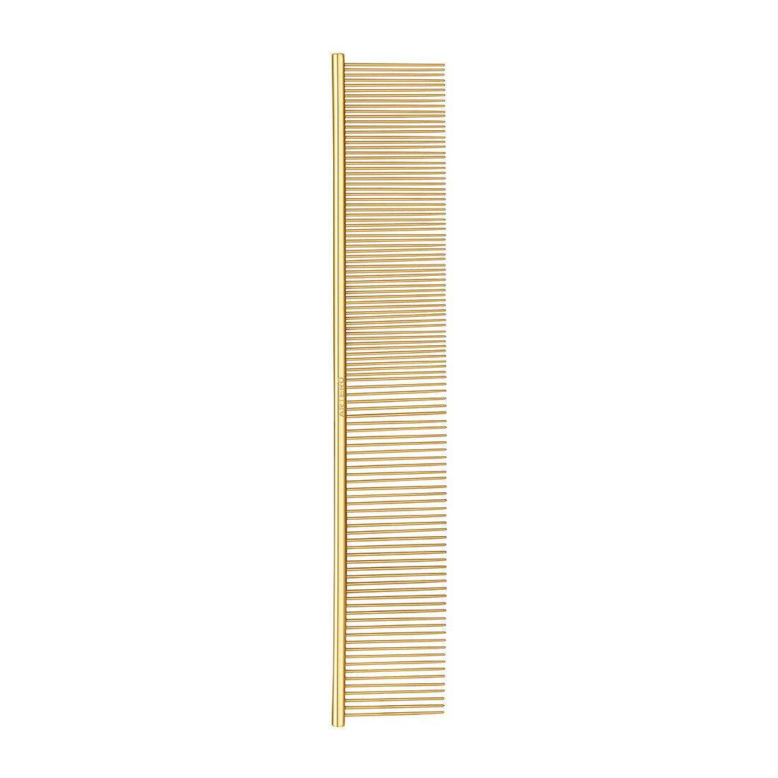 The comb is made of high-quality metal, with nickel-plated steel teeth, coated with an elegant gold mirror finish. The rounded tips of the pins are gentle on your pet's skin, even sensitive and prone to irritation. The smooth finish of the teeth ensures smooth movement, preventing static, painful tugging, and coat damage, making brushing a pleasure for both you and your pet. Moreover, these smoothly polished pins help distribute natural oils from roots to ends, giving the coat a healthy shine.