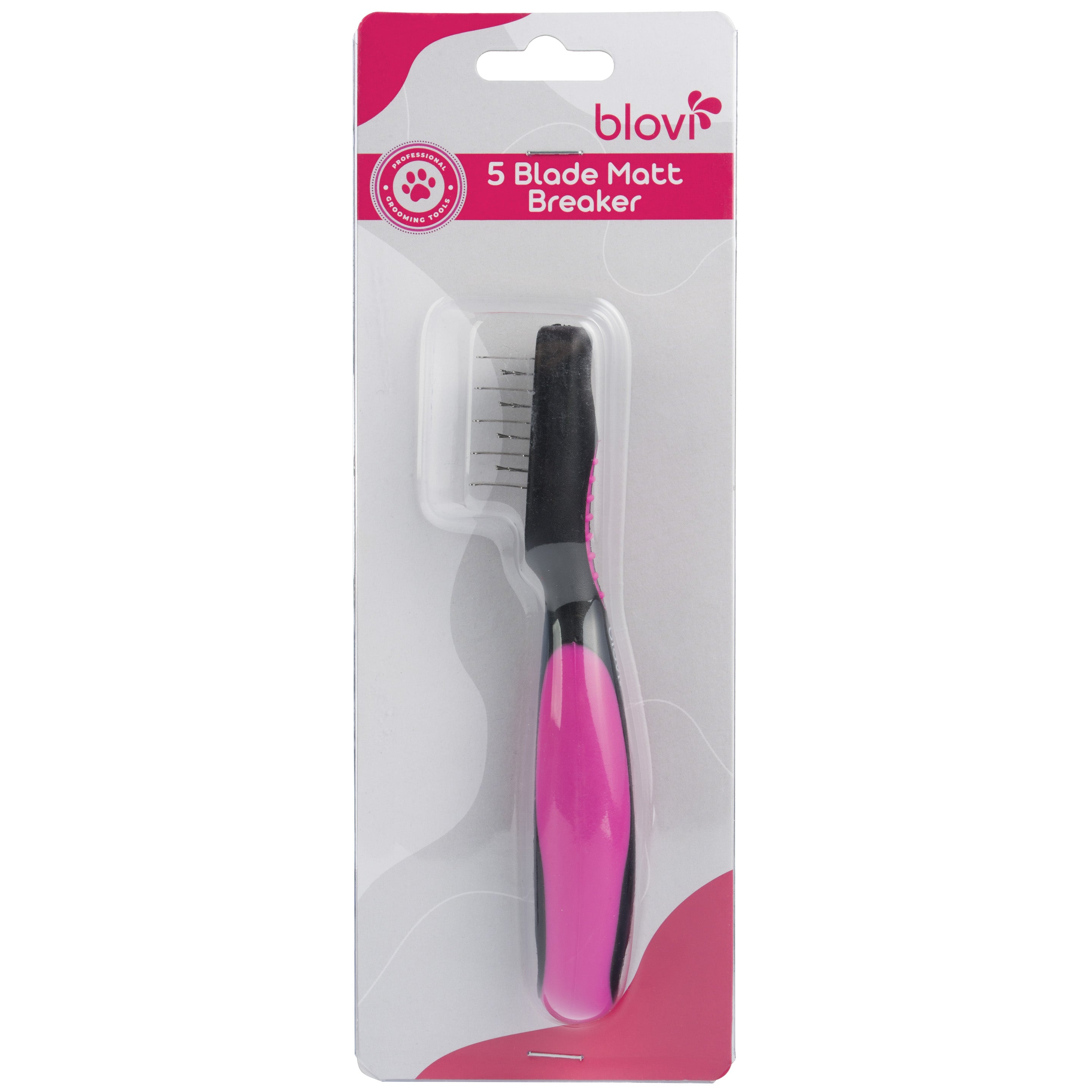 The Blovi 5 Blade Matt Breaker Dog Felt Brush is designed to combat matted and tangled fur with its sharp metal hook blades and ergonomic handle.