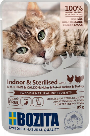 Bozita Indoor & Sterilised with Chicken and Turkey is a fully balanced food for adult cats, ideal for indoor and sterilised cats, and suitable for senior and overweight cats.