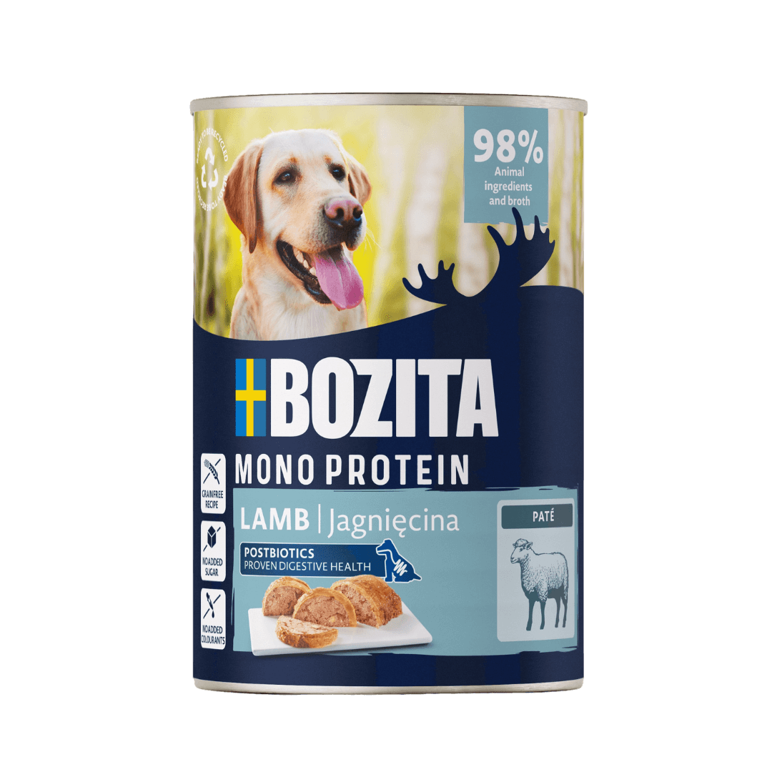 Bozita Monoprotein Pate with Postbiotics supports a dog's health by improving digestion, balancing gut flora, and strengthening the immune system.