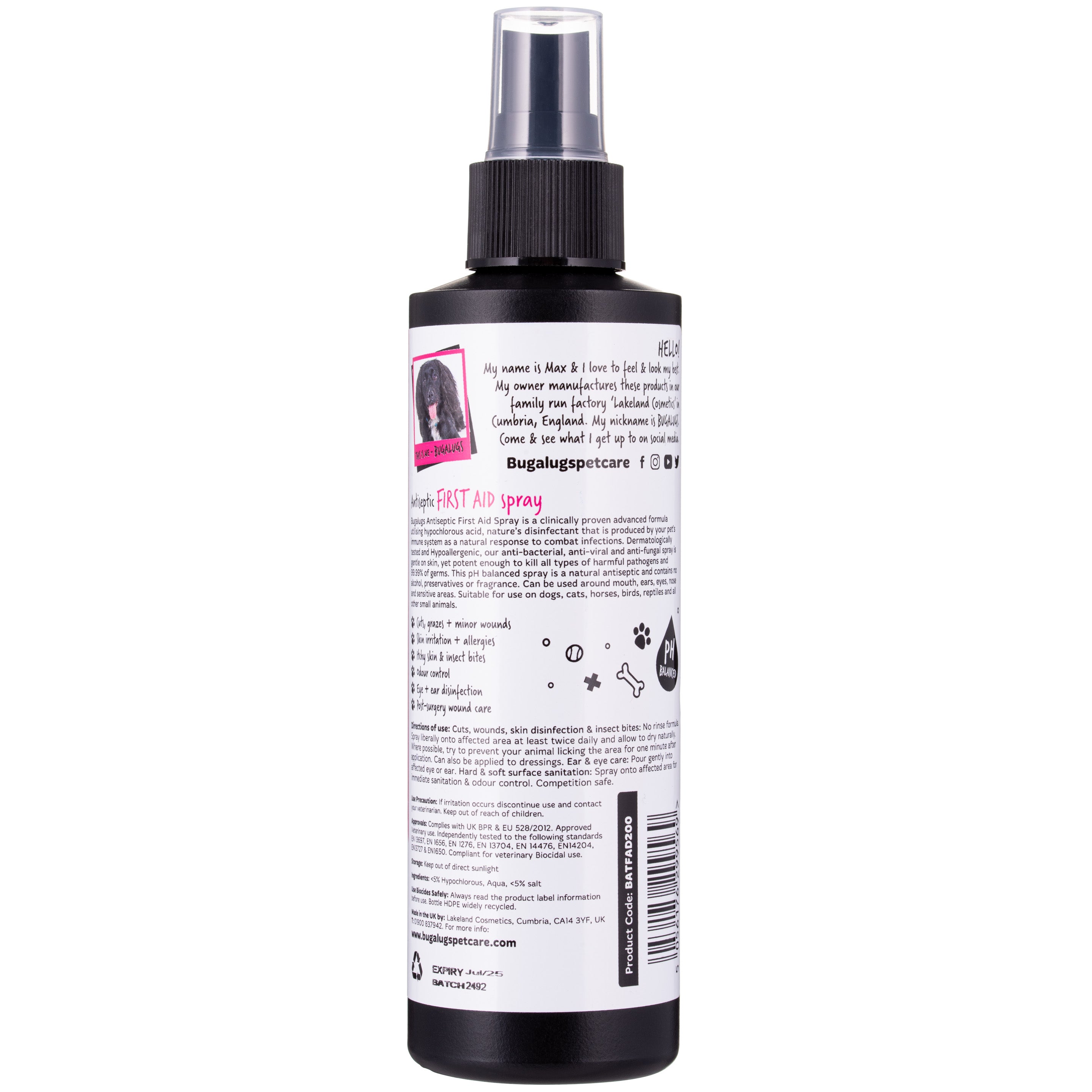 Bugalugs Antiseptic First Aid Spray is a hypoallergenic antiseptic for dogs and cats, using hypochlorous acid to cleanse and heal minor wounds and skin irritations.