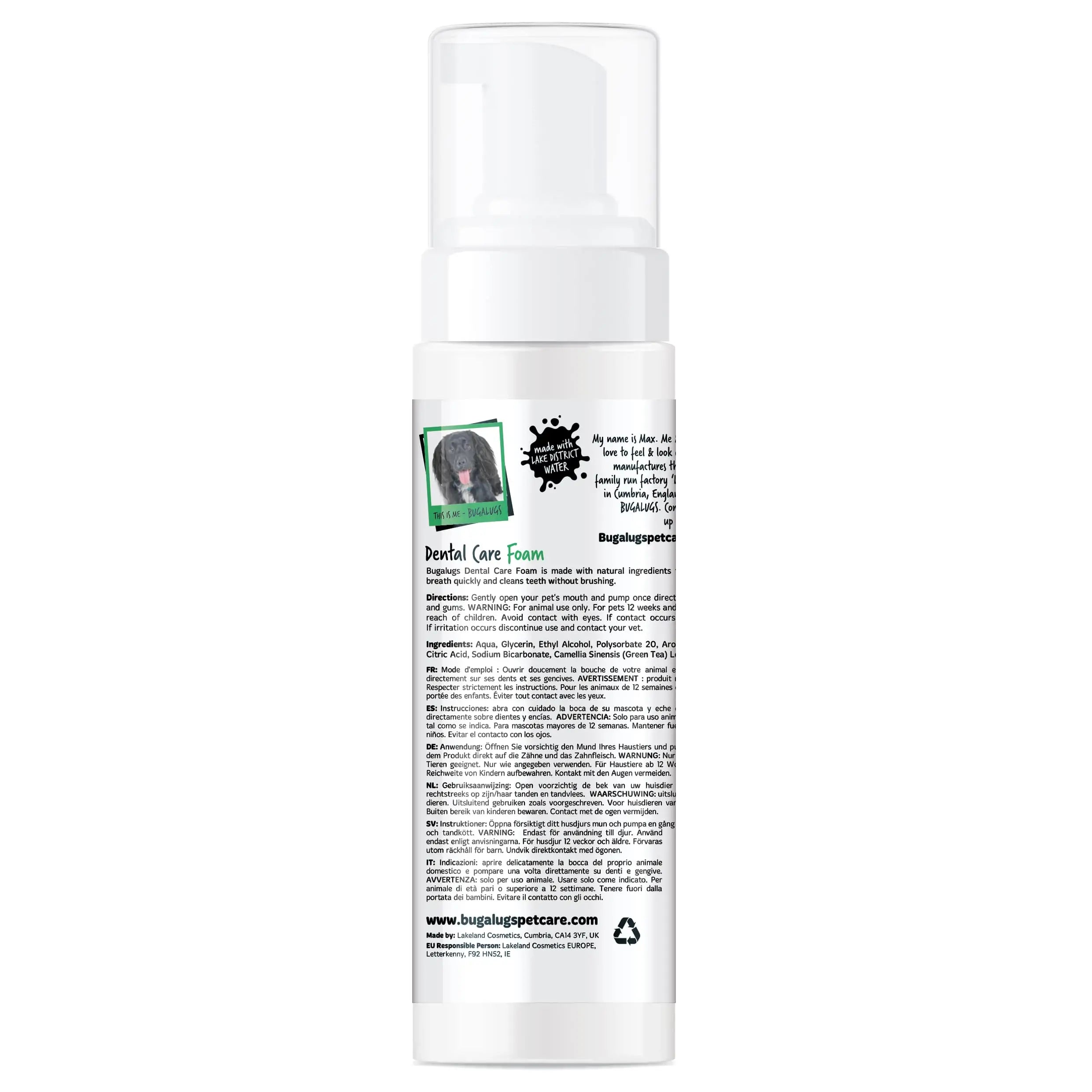 Bugalugs Dental Foam is a gentle oral hygiene solution for dogs and cats, helping combat plaque, tartar, and bad breath without brushing, made with natural ingredients.
