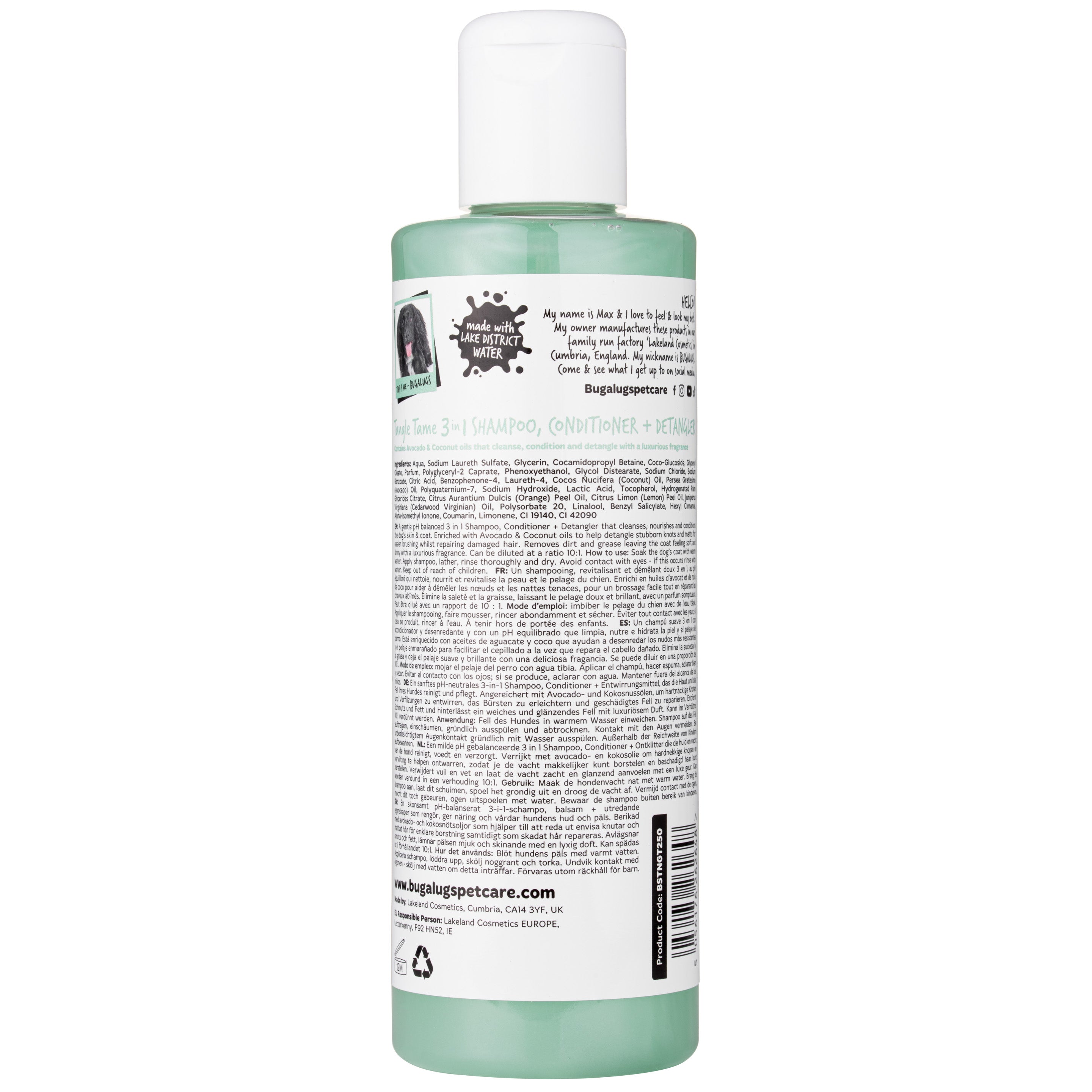 Bugalugs Tangle Tame 3-in-1 Shampoo is an indispensable grooming product for any dog for whom bathing and brushing are the ultimate punishment. Busy owners looking for a quick and effective grooming solution will also appreciate this product. This multi-tasking product not only gently yet effectively cleanses your dog's coat of dirt, but also nourishes and cares for its appearance. The added detangler makes brushing even the most tangled coat effortless and takes only a moment.