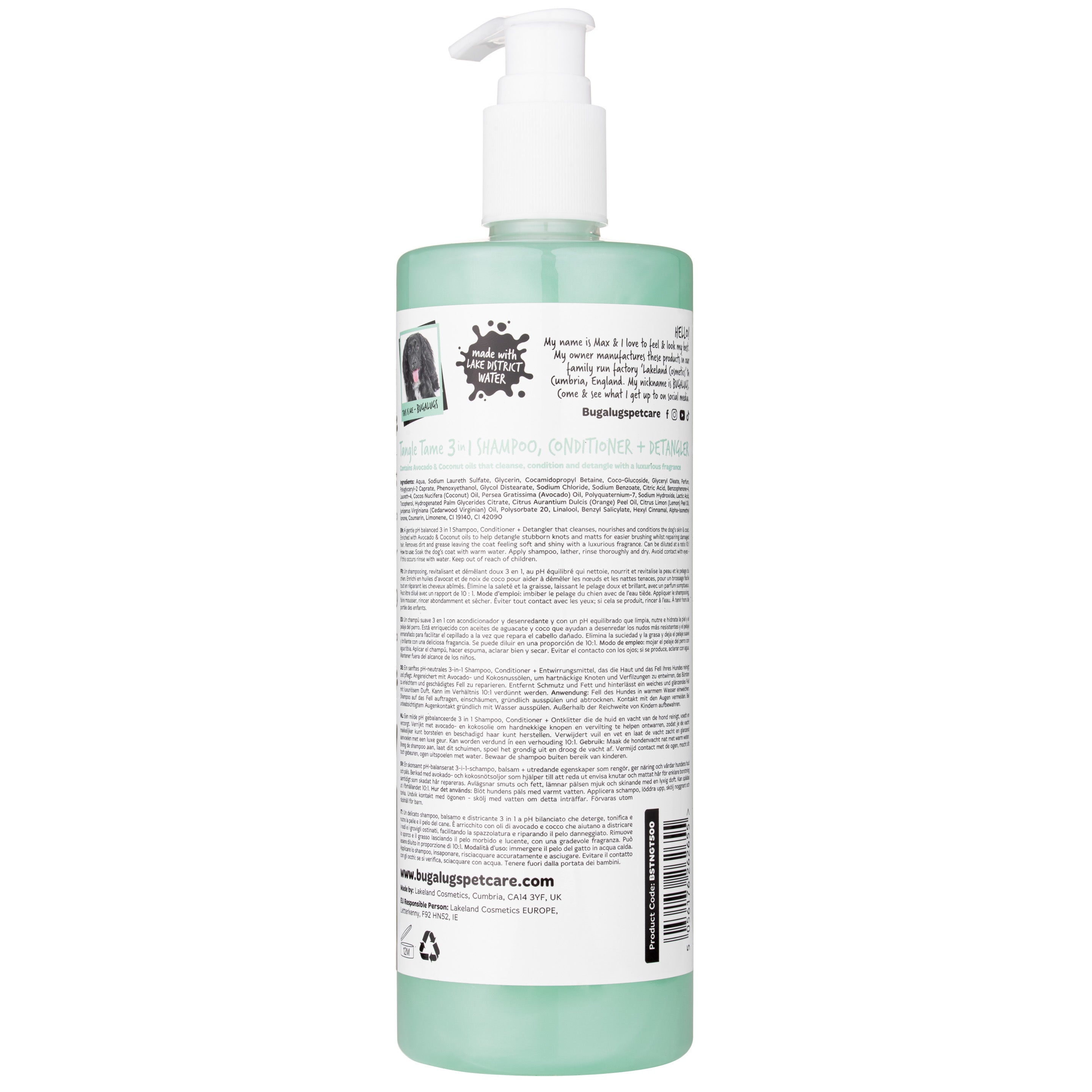 Bugalugs Tangle Tame 3-in-1 Shampoo is an indispensable grooming product for any dog for whom bathing and brushing are the ultimate punishment. Busy owners looking for a quick and effective grooming solution will also appreciate this product. This multi-tasking product not only gently yet effectively cleanses your dog's coat of dirt, but also nourishes and cares for its appearance. The added detangler makes brushing even the most tangled coat effortless and takes only a moment. The product regenerates, moisturizes, and rebuilds your dog's coat. It soothes skin irritations and improves its elasticity. It's perfect for caring for dry, dull, and brittle fur. It removes unpleasant, "dog" odors and leaves a delightful avocado and coconut scent. The product lathers well and rinses off easily. Suitable for all coat types and colors. It can also be used on puppies over 8 weeks of age. It's suitable for both home use and professional grooming at a salon. 100% UK-made, with water from the Lake District, a biologically clean area and a UNESCO World Heritage Site. Concentrated and effective.