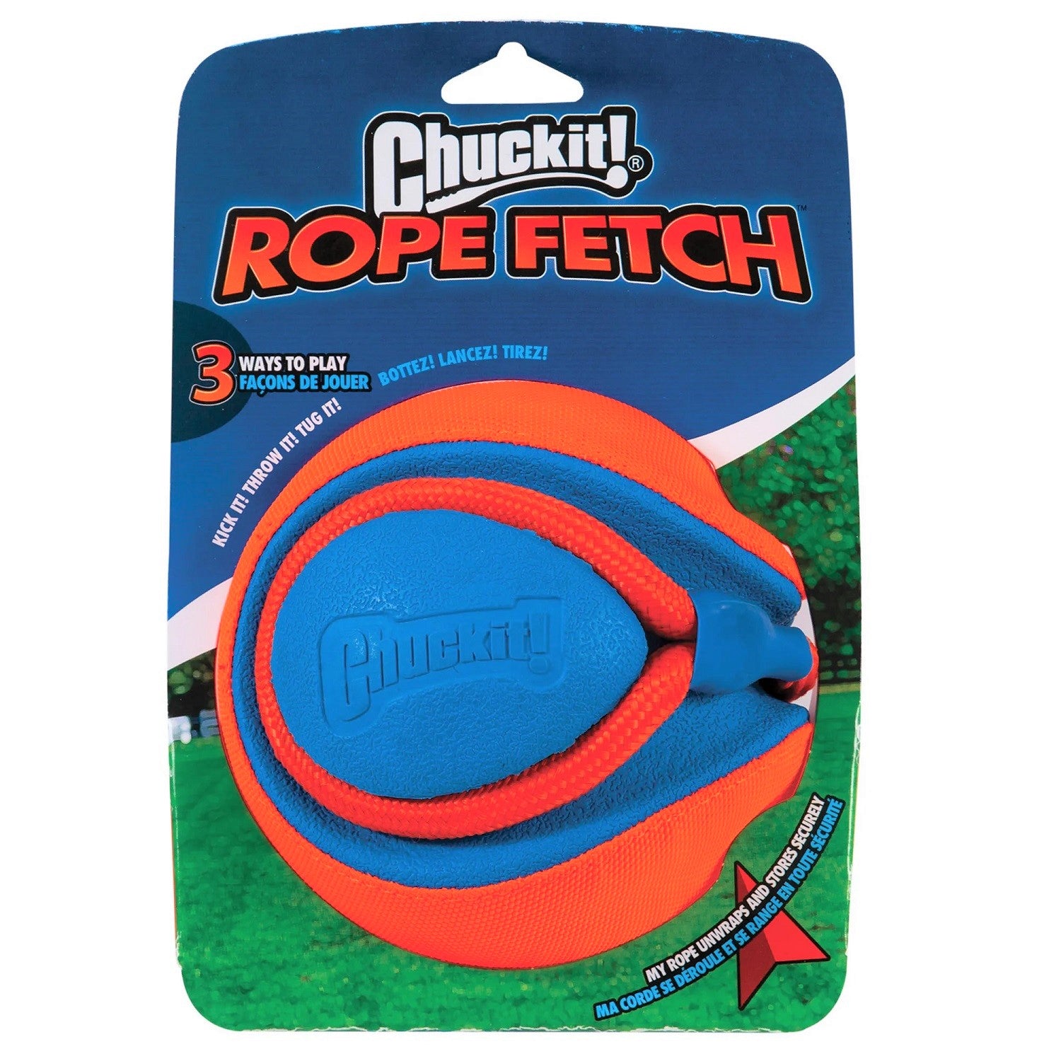 The Chuckit! Rope Fetch is a versatile dog toy perfect for throwing, kicking, and tugging, designed for dogs who love playing with a ball.