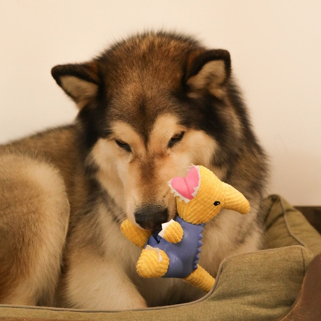 - The squeaker hidden in the dinosaur's head supports your dog's oral hygiene.