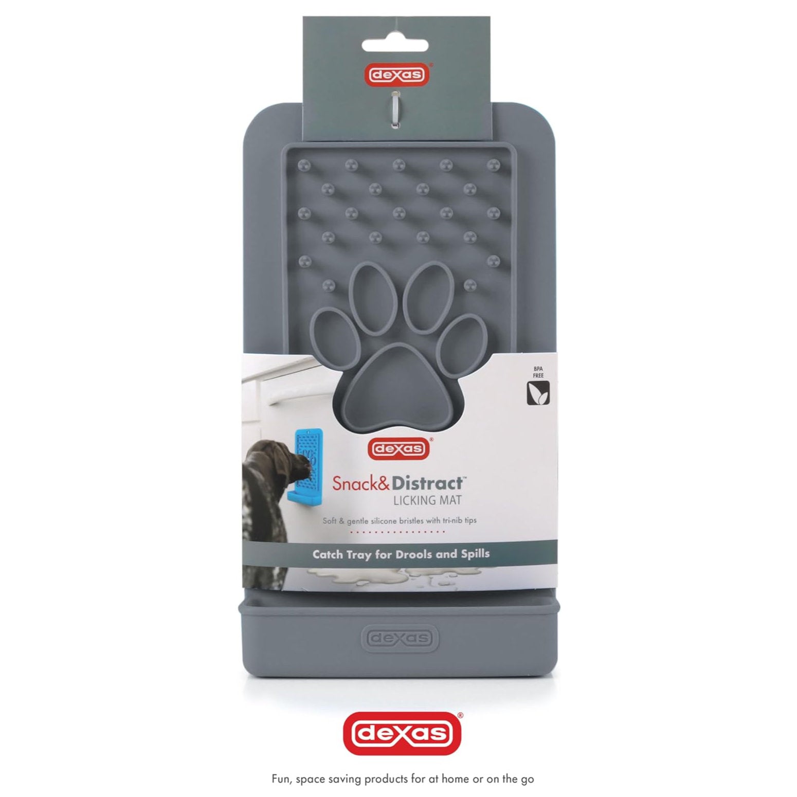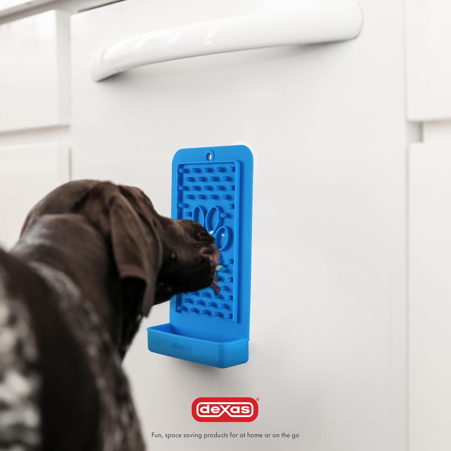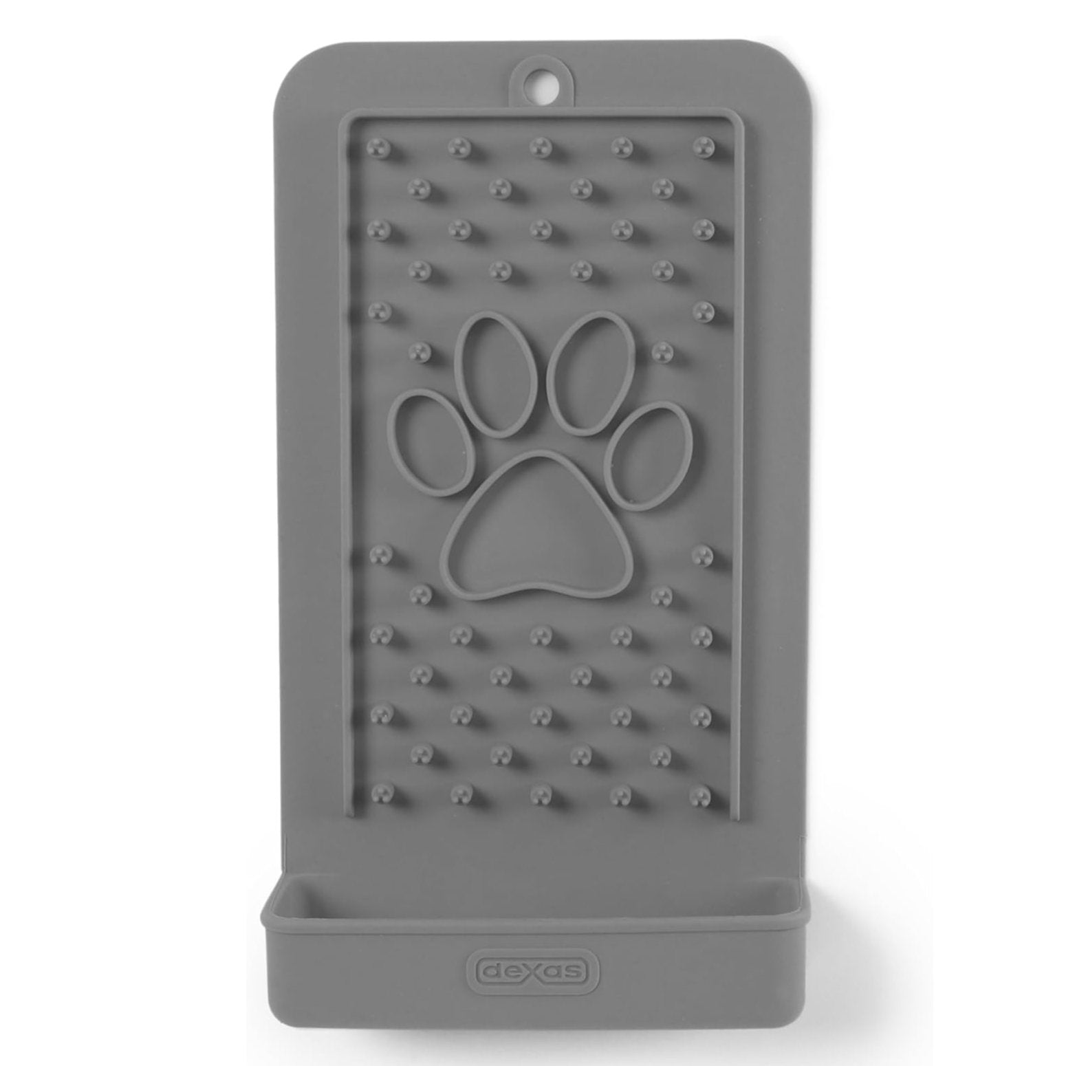 The Dexas Snack & Distract silicone mat for dogs and cats is perfect for licking sticky treats, wet food, or toothpaste, providing entertainment and relaxation for your pet.