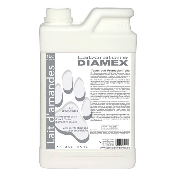 Diamex Lait D'amandes Almond Oil Shampoo – Concentrated Formula 1:8, 1L Bottle, Nourishing All Coats