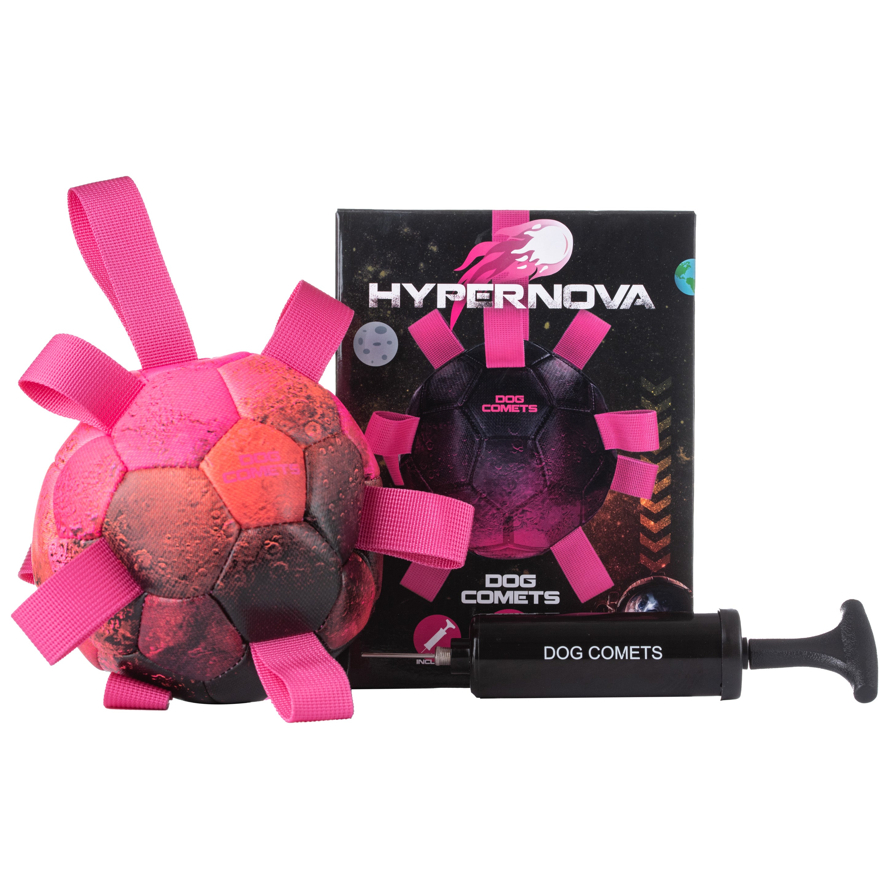 The Dog Comets Hypernova is a dog soccer ball with numerous webbing handles. It includes a pump and is perfect for fetching medium and large dogs. The ball has no squeaker.