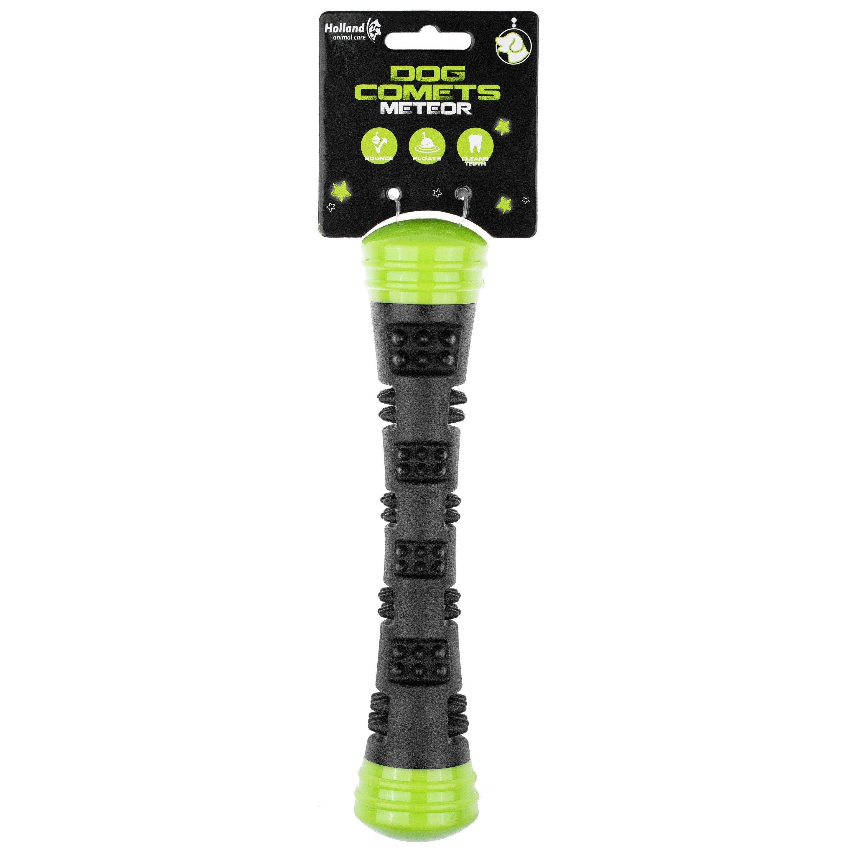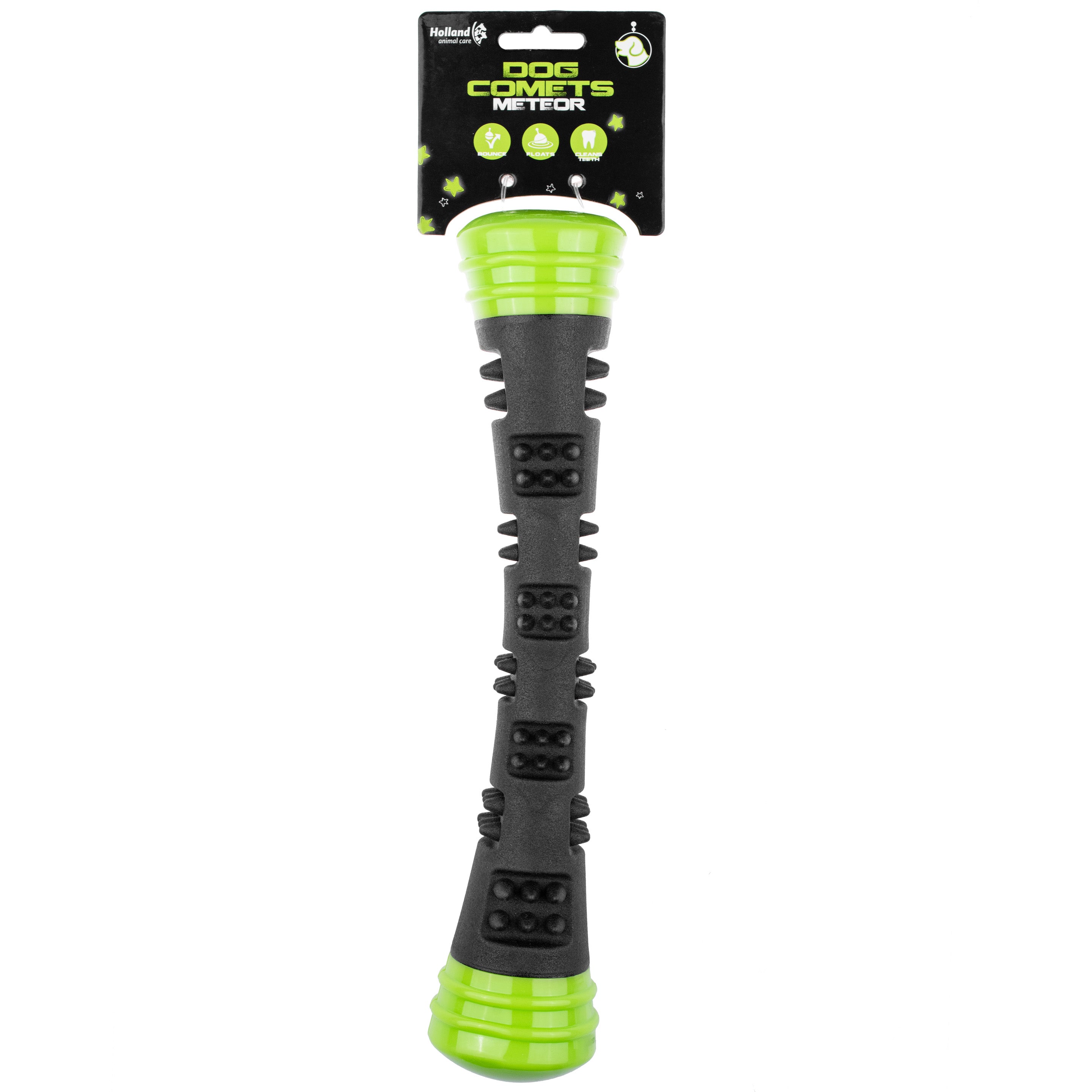 Dog Comets Meteor Green is a dog fetch toy. This safe rubber stick with protrusions and two squeakers is the best alternative to natural sticks full of splinters and burrs. Perfect for throwing and tugging with your dog on land and in the water. Made of safe, thermoplastic material, this fetch has numerous protrusions in the center that clean your dog's teeth and massage their gums. It bounces strongly when thrown, and two squeakers hidden in the ends of the stick provide your dog with additional encouragement. The fetch won't sink in water and is a great accessory for the beach or lake. The contrasting green tips make it easy to find the dark gray toy in tall grass and sand.