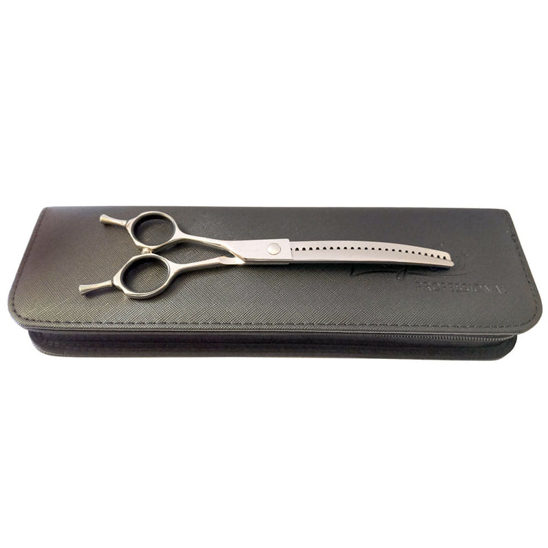 Professional bent single-sided thinning irons with Convex blades. A model dedicated to left-handed people. They are made of high-quality 440C stainless steel with a hardness of 60HRc. The scissors are perfectly balanced and fit perfectly in the hand, ensuring high comfort of use. The bent form allows for precise and versatile shaping of hairstyles and conducting lines in an arc. Thanks to this solution, you can achieve the desired hairstyle for breeds requiring semi-round shapes and obtain a beautiful and natural final effect.