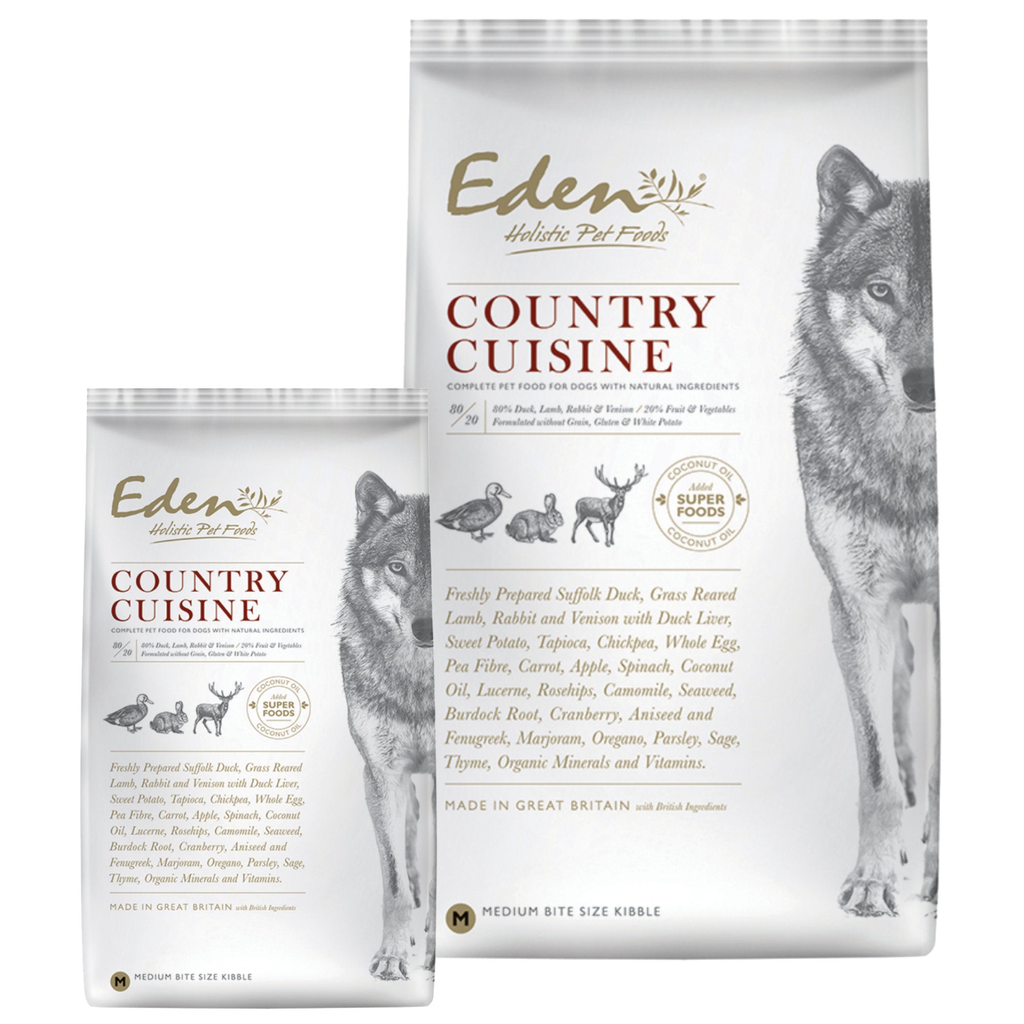 Fresh duck 30%, dried duck 13%, sweet potato 13%, fresh lamb 10%, dried rabbit 8%, fresh venison 7%, duck fat 5%, tapioca 3.5%, chickpeas 3.5%, dried lamb 3%, dried eggs 2%, duck liver 2%, pea fiber 0.5%, vitamins and minerals, carrots, apples, spinach, coconut oil 0.06%, alfalfa, rosehips, dried camomile, dried root burdock, anise, fenugreek, algae, cranberries, fructooligosaccharides (461 mg/kg), glucosamine (341 mg/kg), MSM (341 mg/kg), chondroitin sulphate (240 mg/kg), marjoram, oregano, parsley, sage.