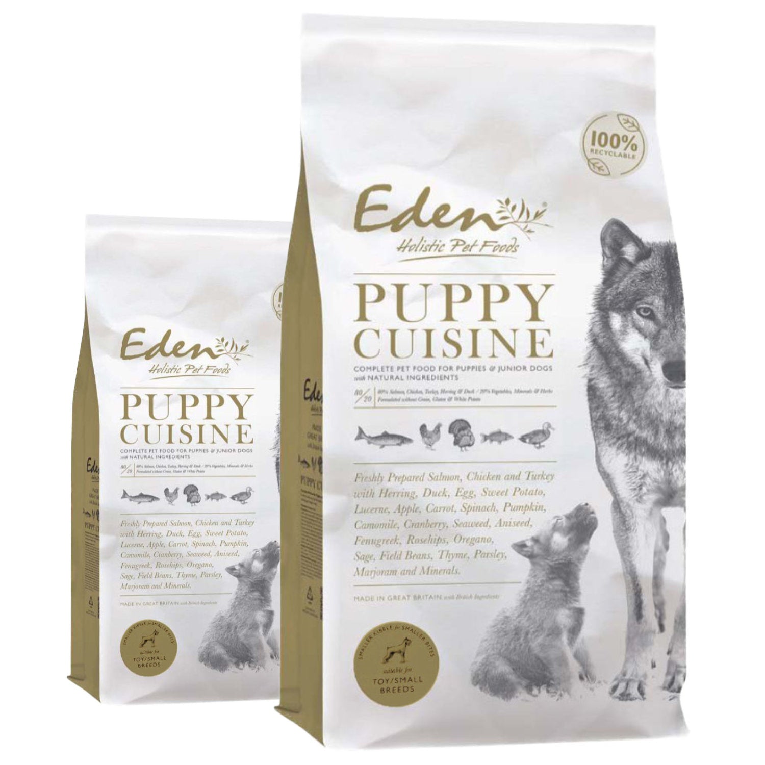 Eden Puppy Cuisine is a complete, well-balanced meal for puppies and juniors of small breeds, made with top-quality ingredients like salmon, chicken, and turkey.