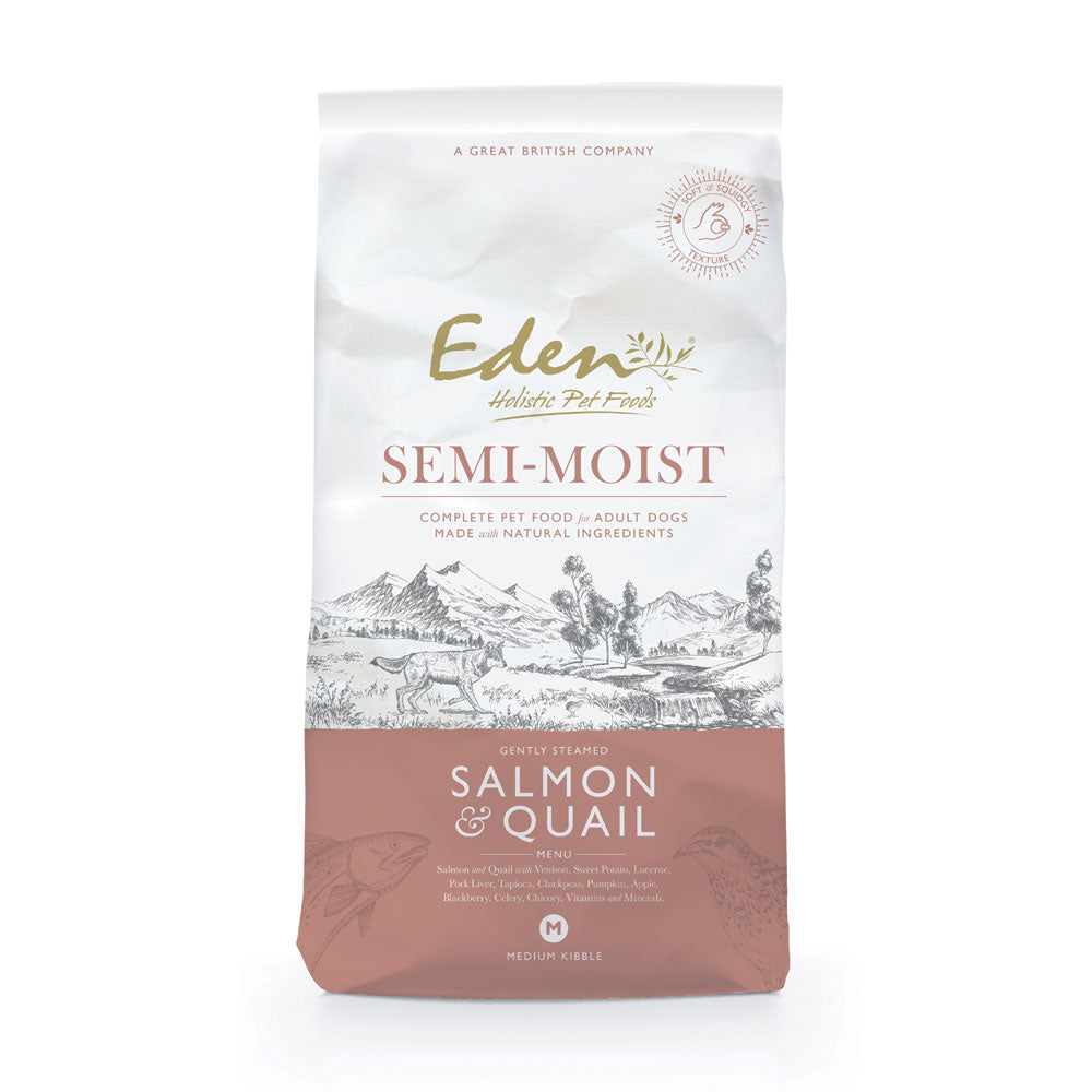Eden Salmon & Quail Semi-Moist is a complete, grain-free dog food that supports healthy skin and coat, ideal for adult dogs of all breeds.