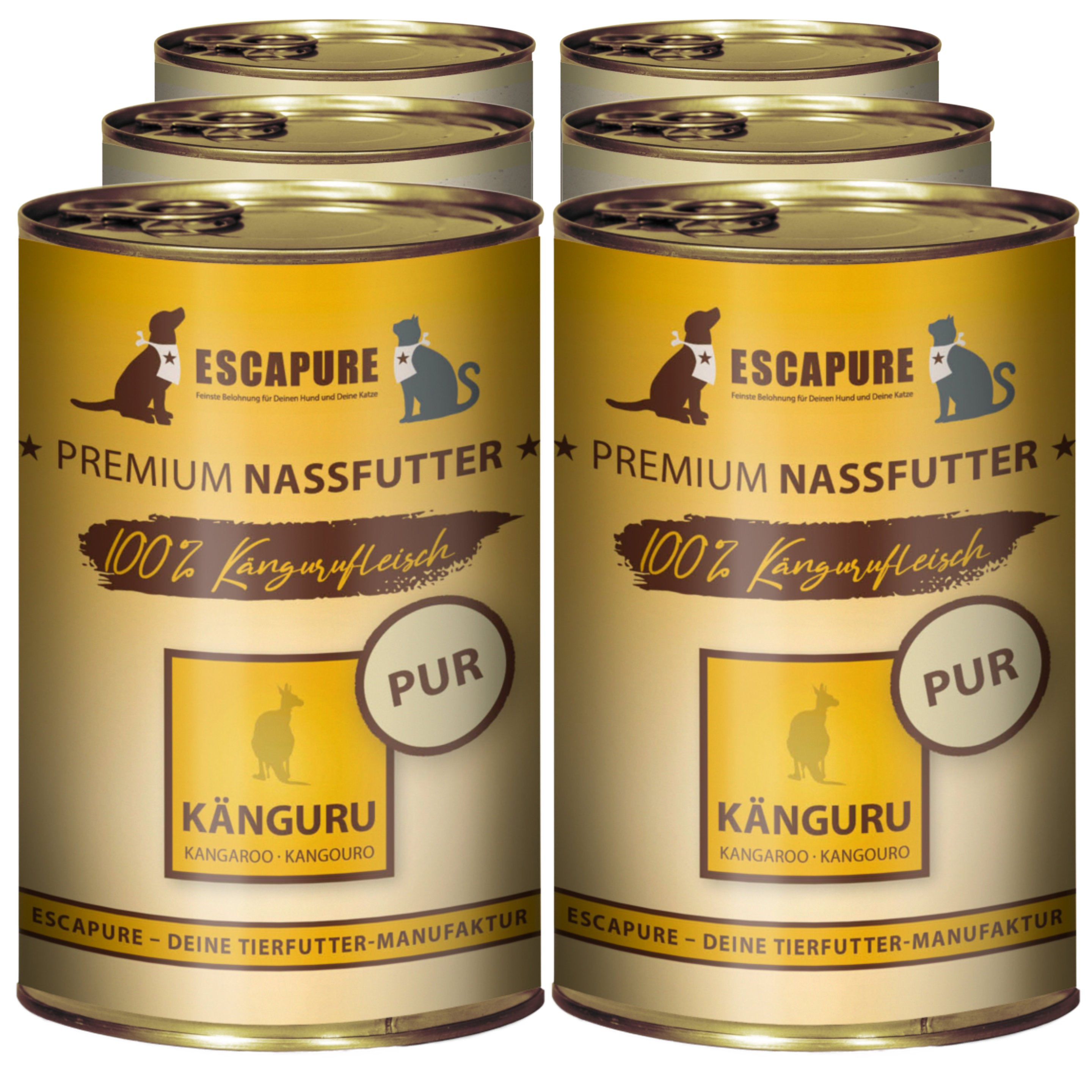 Escapure Kanguru Pur is a top-quality complementary wet food for dogs and cats, made with 100% natural ingredients and premium kangaroo meat, ideal for sensitive pets or those with allergies.