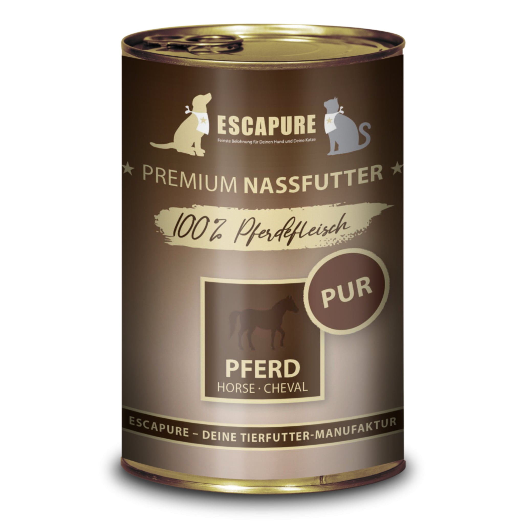 Escapure Pferd Pur is a top-quality complementary wet food for dogs and cats made with 100% natural ingredients, ideal for sensitive pets or those with allergies.