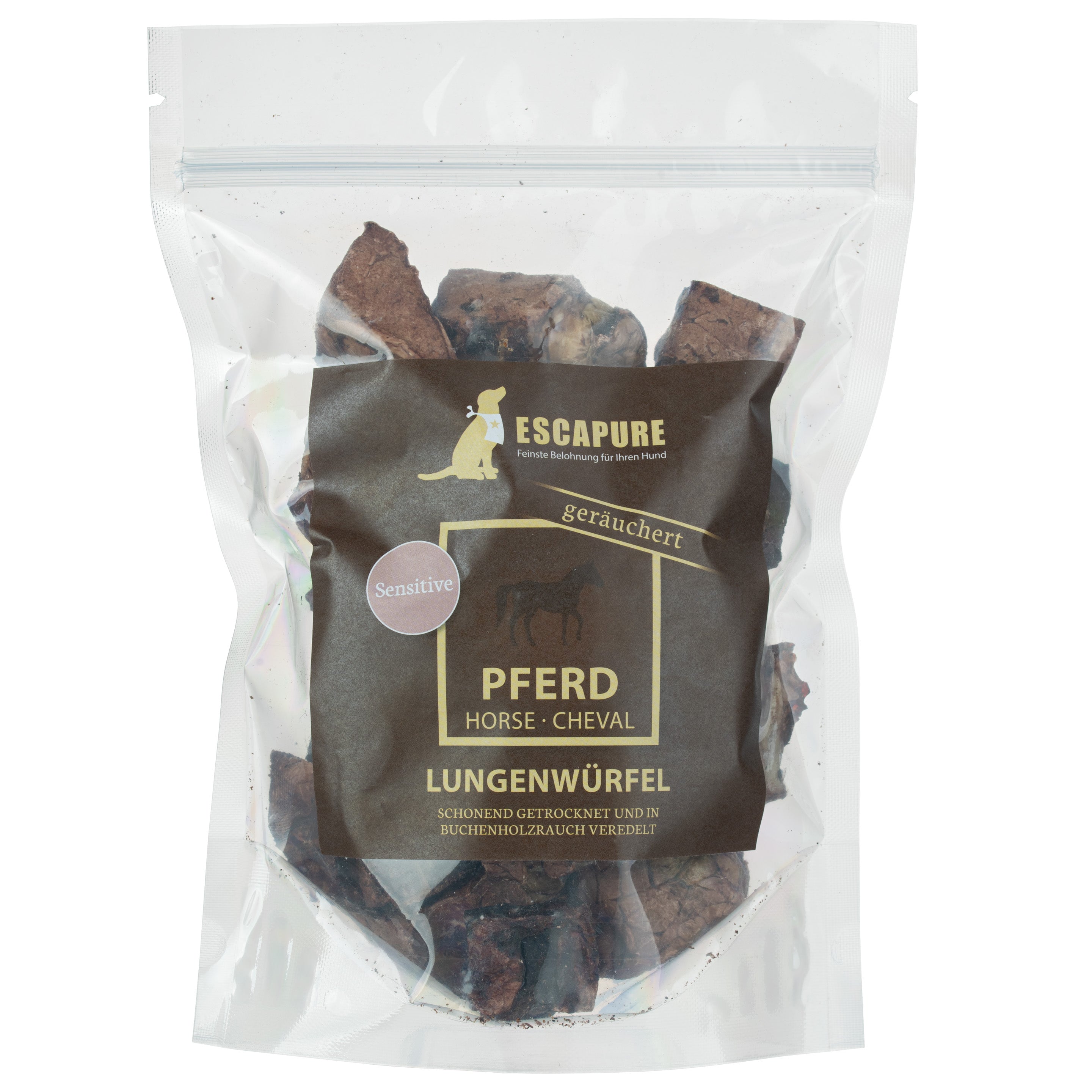 Escapure Pferde Lung Wurfels are delicious dried horse lungs that your dog will love. Designed for medium and large breeds, these hard cubes are made from horsemeat sourced from local suppliers in Bavaria. These treats are made during a long drying and beechwood smoking process, which lasts approximately 16 days, to preserve the delicious aroma and flavor of horse lungs. They are free from artificial colors, preservatives, and sugars. They are also gluten-free and mono-protein, making them recommended for sensitive animals, those suffering from allergies, or digestive issues. The dried lung pieces are relatively hard, guaranteeing long hours of chewing and gnawing. This positively impacts your dog's oral hygiene and helps them relax and de-stress. Convenient, zip-lock packaging ensures their freshness is maintained for longer. Escapure treats are 100% natural, irresistible to any pet.