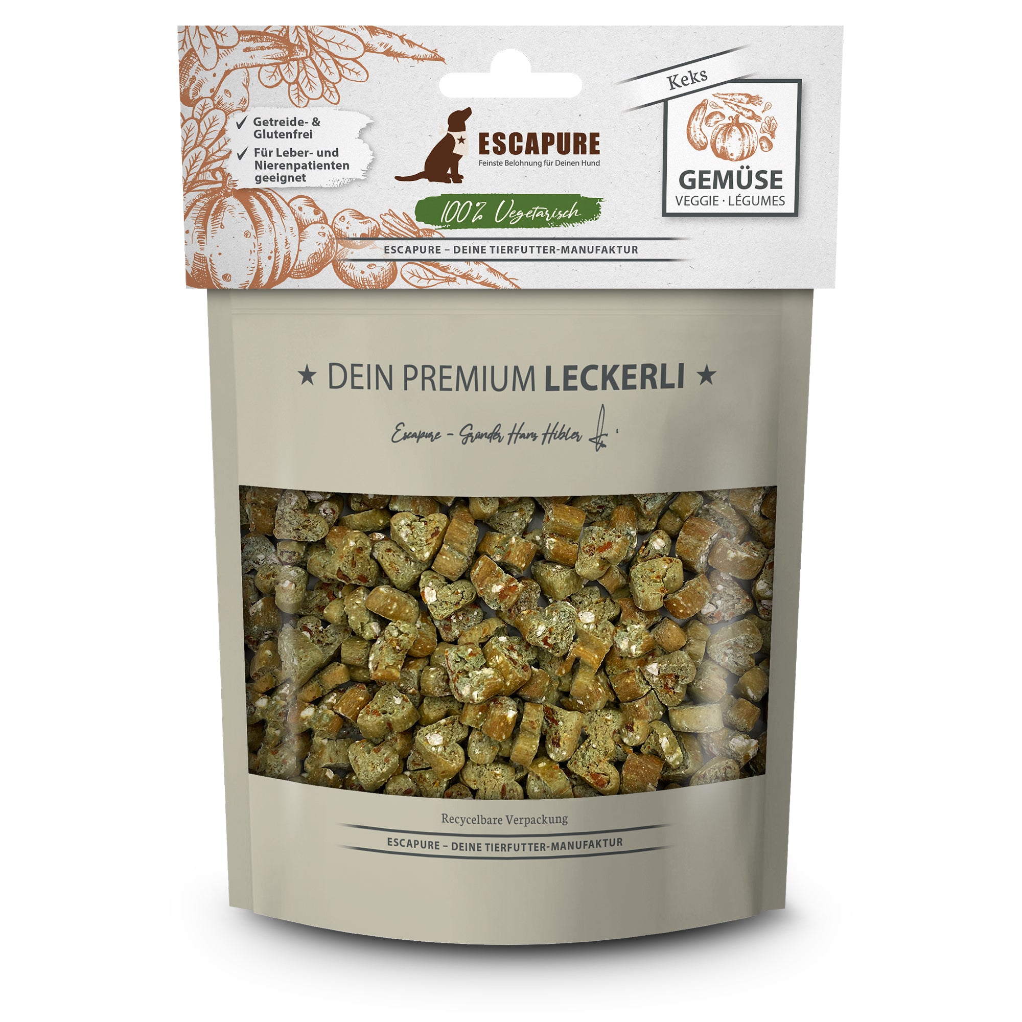 Escapure Premium Keks Gemuse are natural dog biscuits made with dried vegetables and a touch of hard cheese, providing a healthy snack option for dogs.