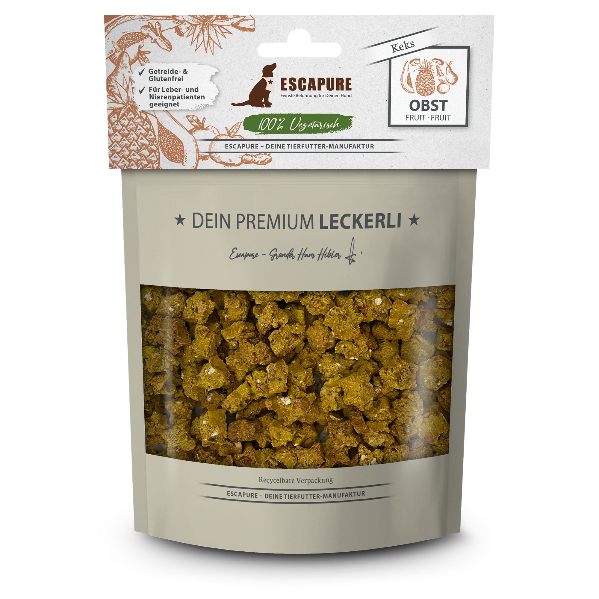 Escapure Premium Keks Obst are natural dog biscuits made with nutritious dried fruit, providing a healthy reward for your dog during training, walks, or travel.