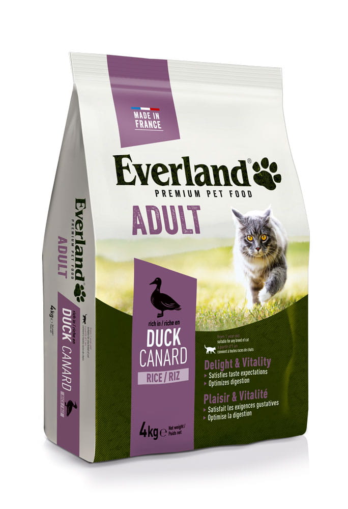 Everland Adult Cat with Duck is a nutritious food for cats aged 1 year and above, suitable for all breeds, providing essential nutrients for vitality.