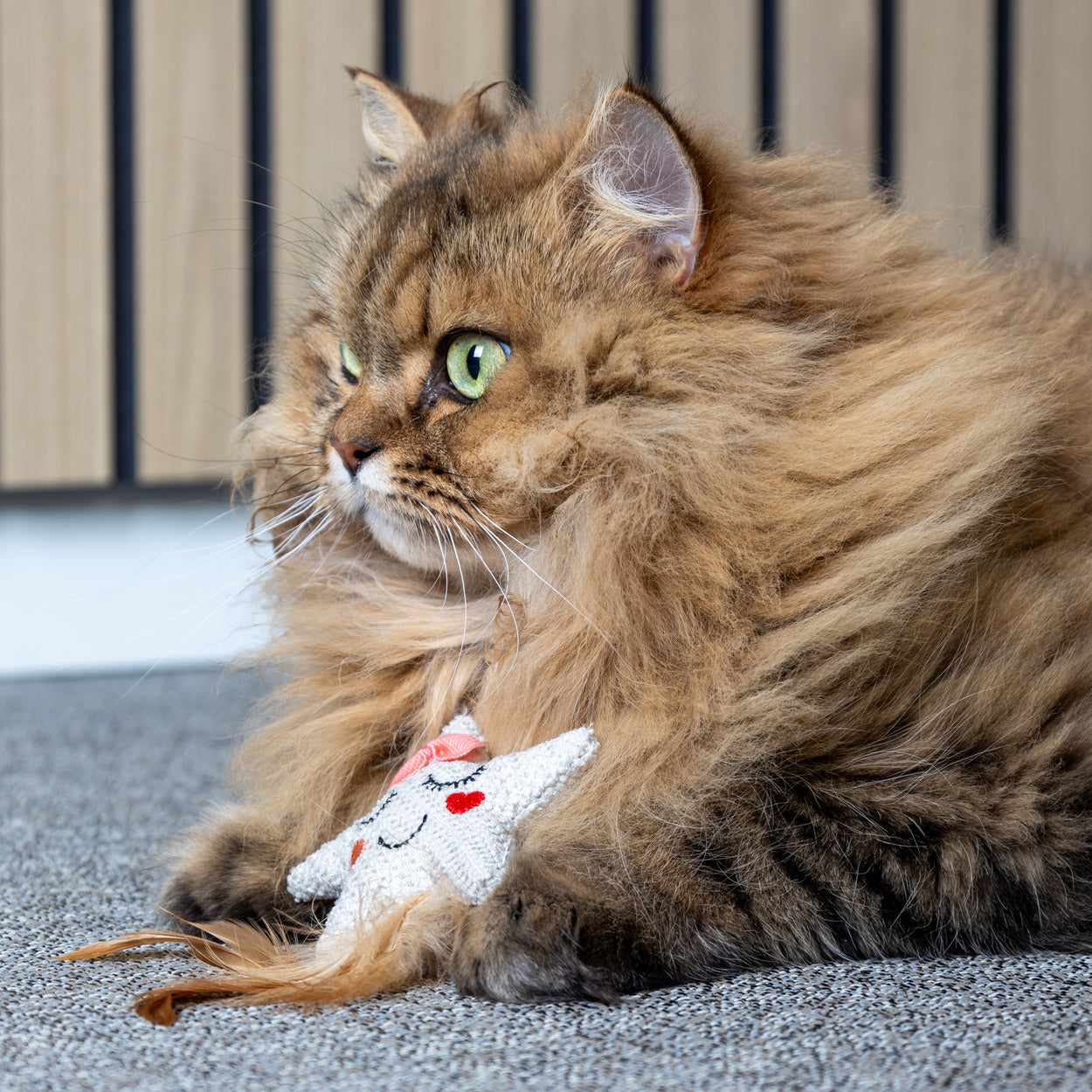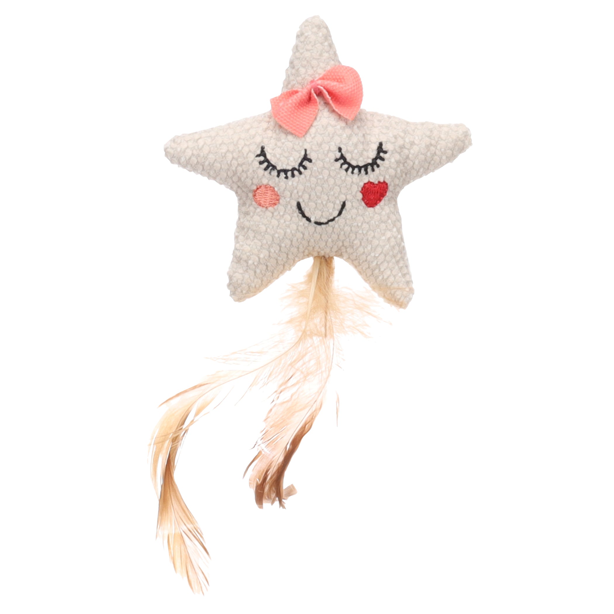 Made of soft, textured fabric, it features an embroidered face and bow. The body, made of beige, textured fabric and complemented by harmonious colors, looks incredibly stylish! Protruding elements encourage your cat to nibble, and by throwing the toy, you provide your cat with healthy activity and help satisfy its instincts to chase, hunt, and catch. The soft body is gentle on cats' teeth, while the star's arms and feathers make the toy easy to grasp. Inside the star is hidden catnip, a favorite of most cats. The added catnip accelerates familiarization with the toy and provides your cat with satisfaction.