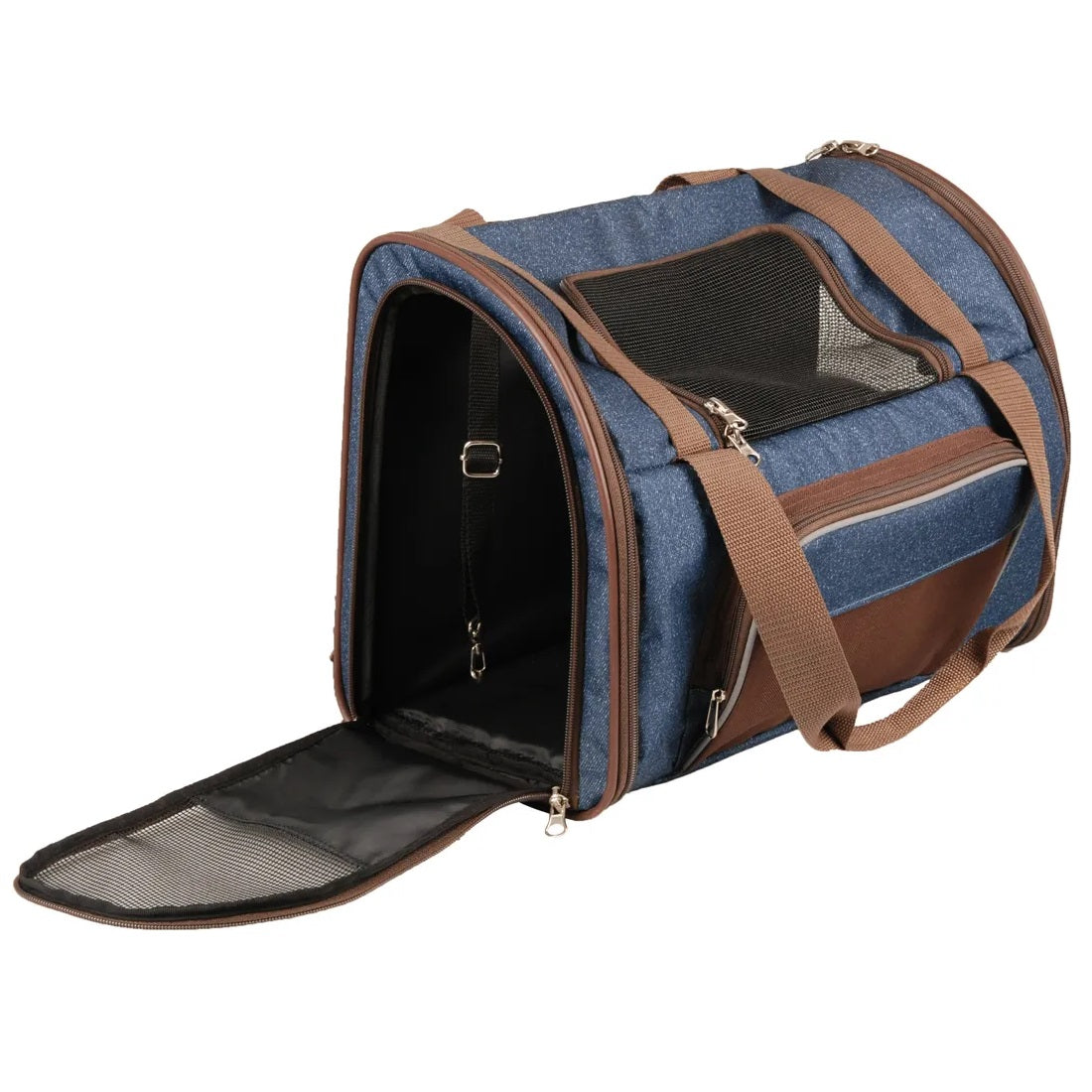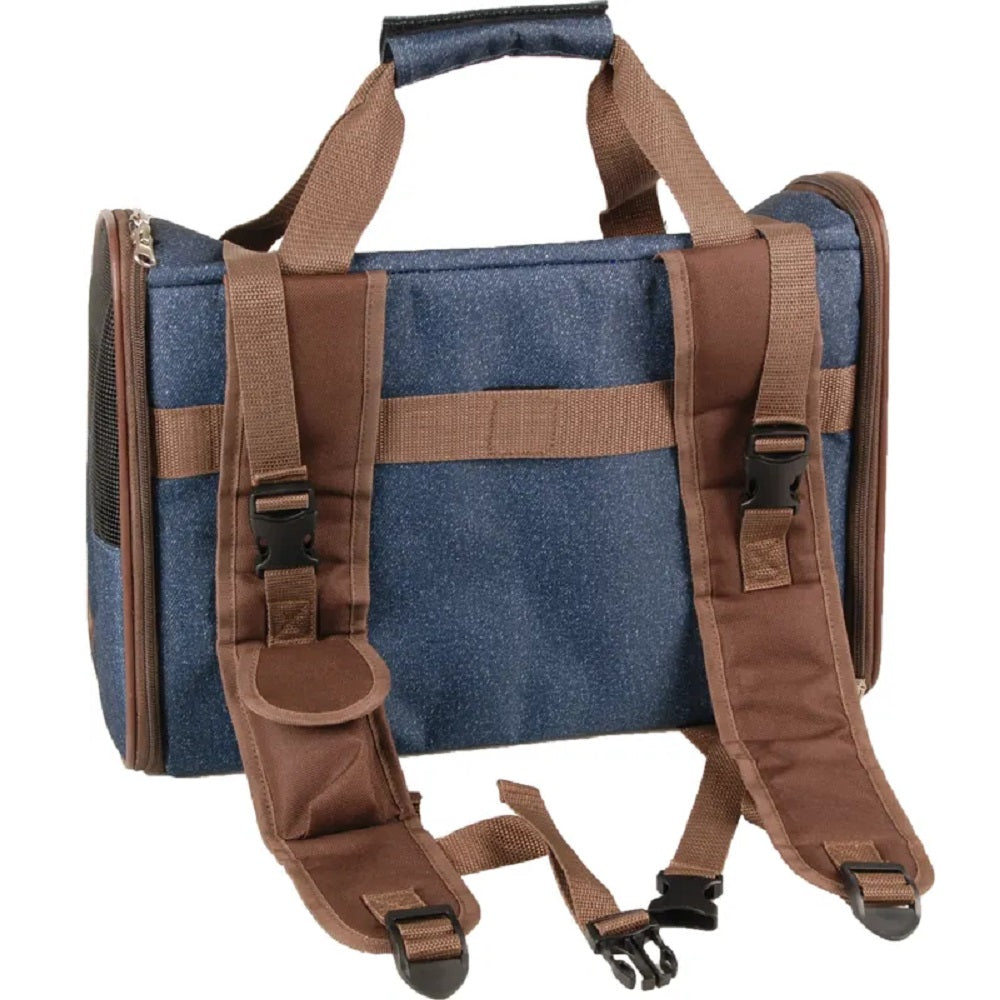 The Flamingo Elodie dog and cat backpack is made of high-quality, denim-effect polyester, in navy blue with brown accents. It's splash-proof and easy to clean. Good ventilation is guaranteed by three windows with a strong vinyl mesh: two on the sides and one on the top, which allow your pets to see their surroundings. One side entrance has a double zipper. The top window and removable sides can also be used as entrances, but be careful with the sides, as they stiffen the structure and, if unfastened, the backpack folds. This solution allows access to your pet from three sides.