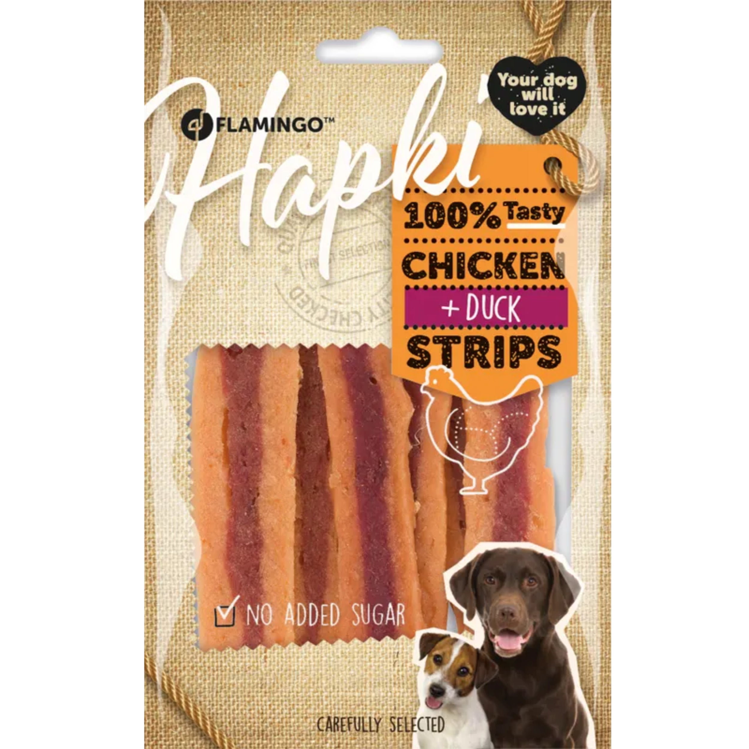 Flamingo Hapki Chicken & Duck Slices are soft, protein-rich treats for dogs over 3 months, ideal for sensitive digestive tracts.