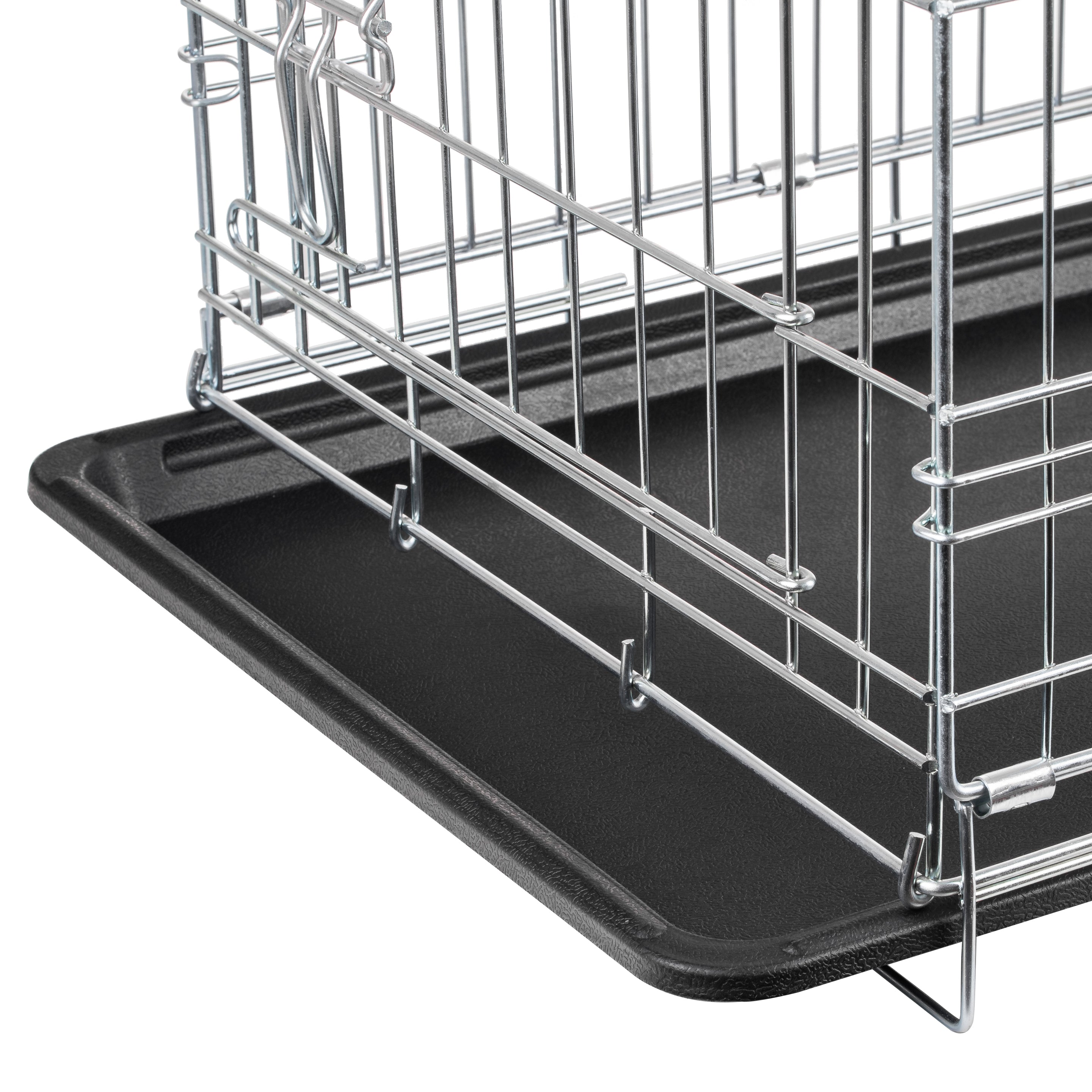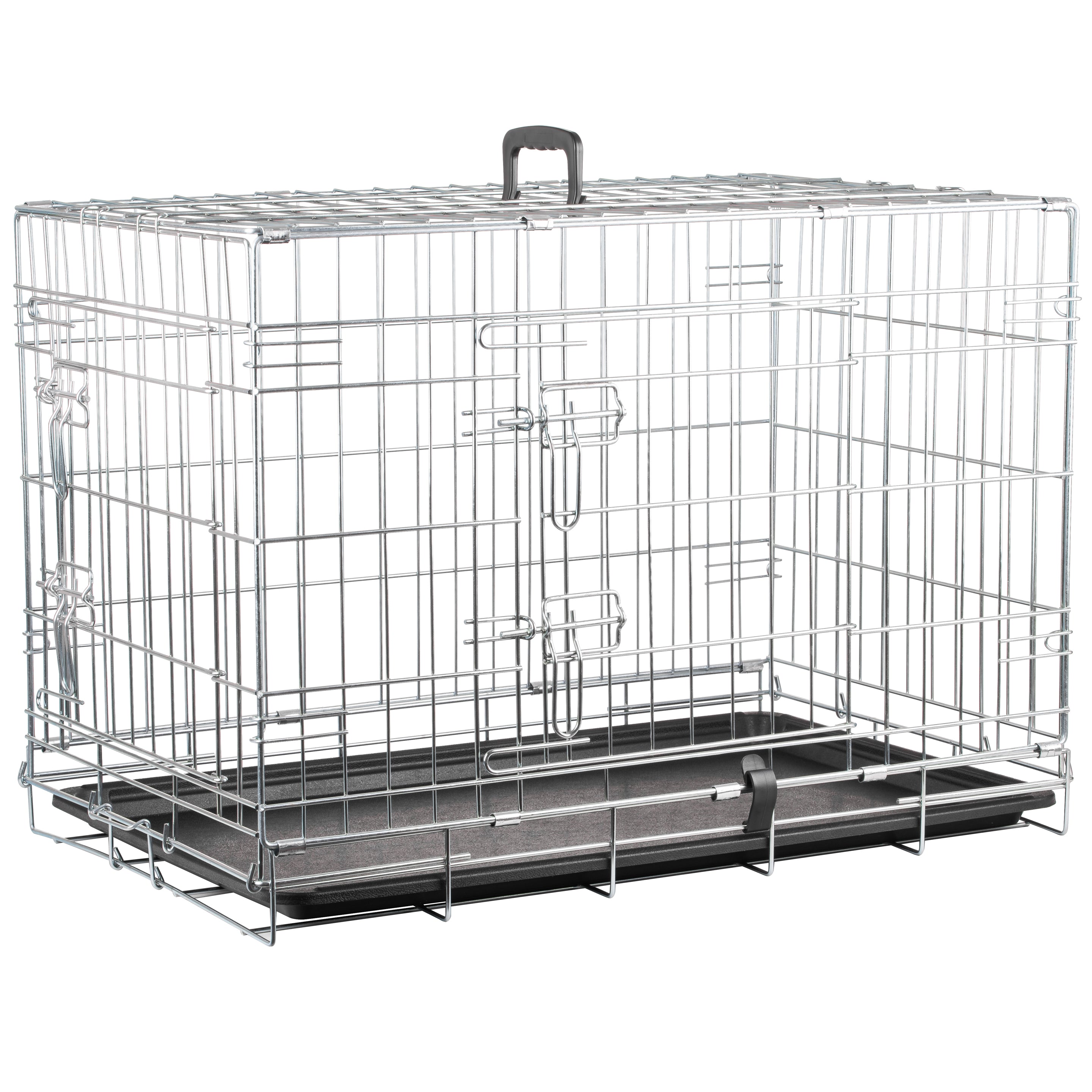 The Flamingo Keo Silver dog kennel features wide, zippered doors at the front and side, allowing for easy access to the interior and versatile placement. The durable plastic floor is easily removed for cleaning, and the entire cage can be quickly folded flat for easy transport and storage when not in use. An attached plastic handle makes it easy to carry.
