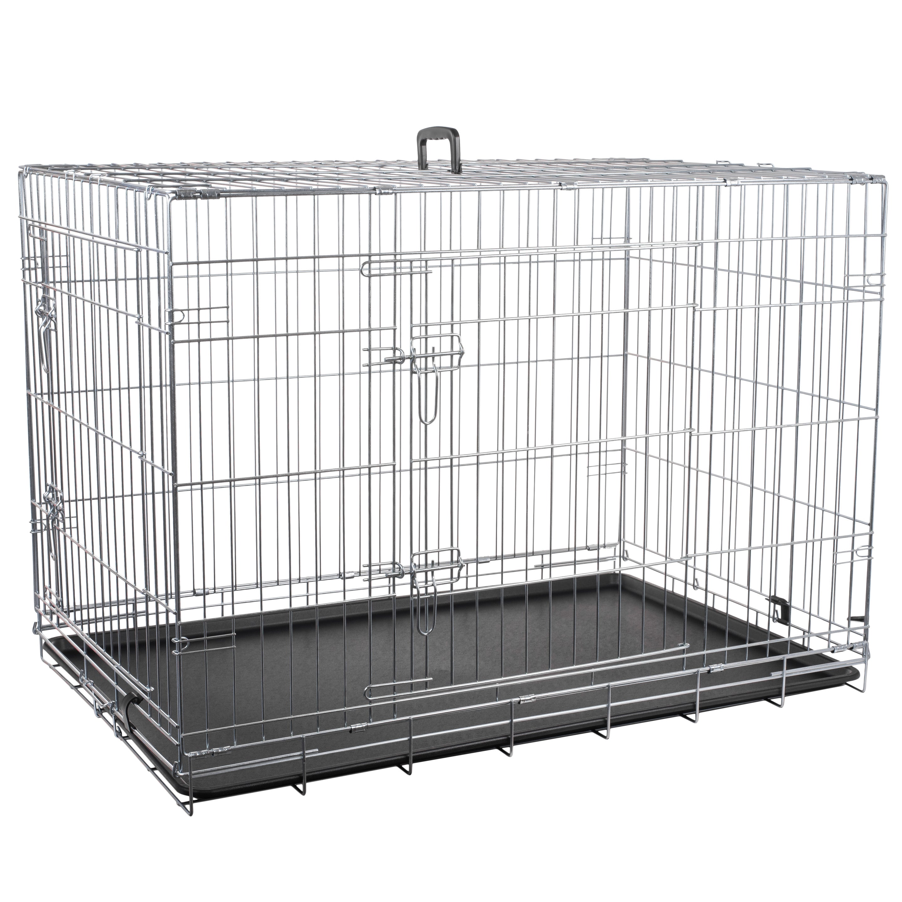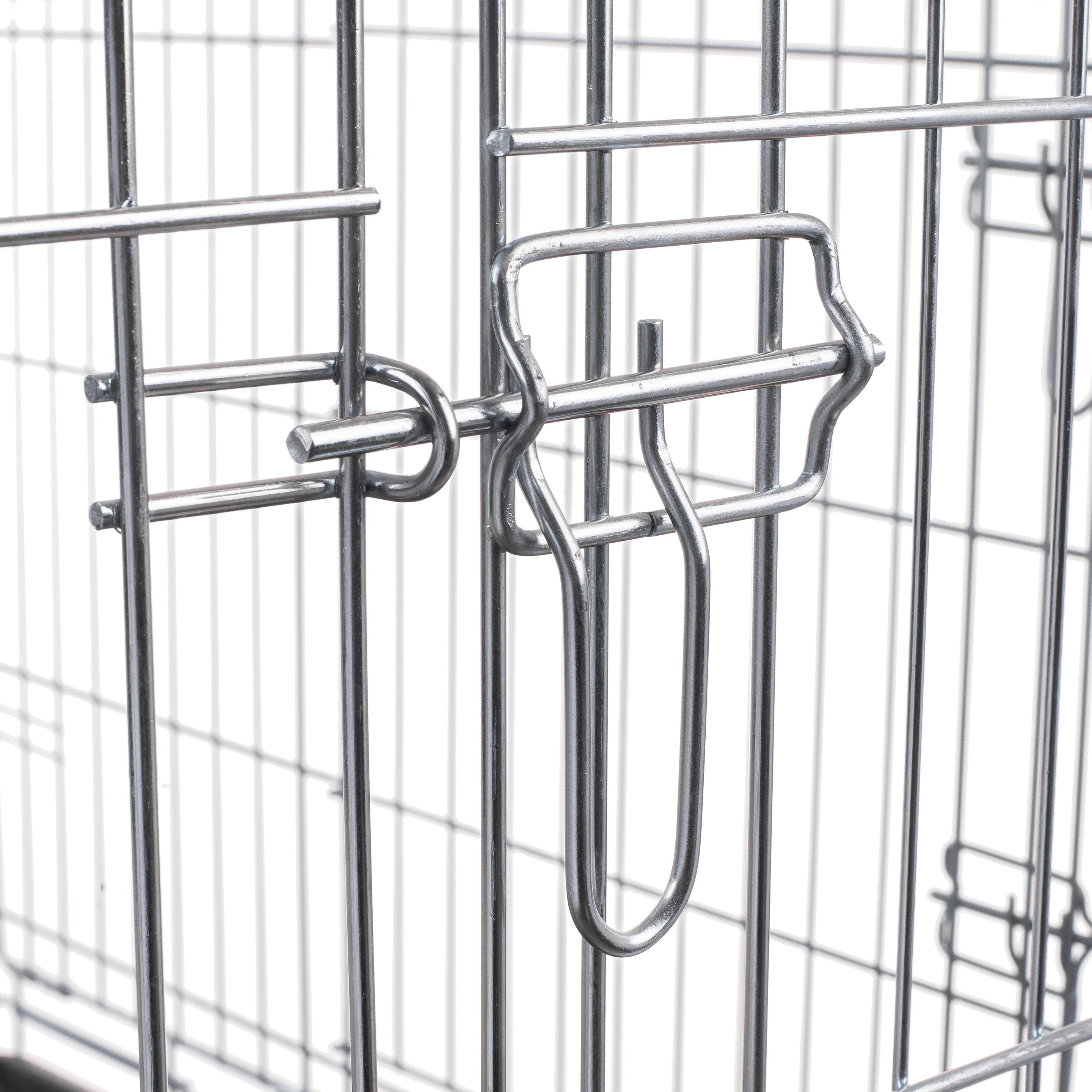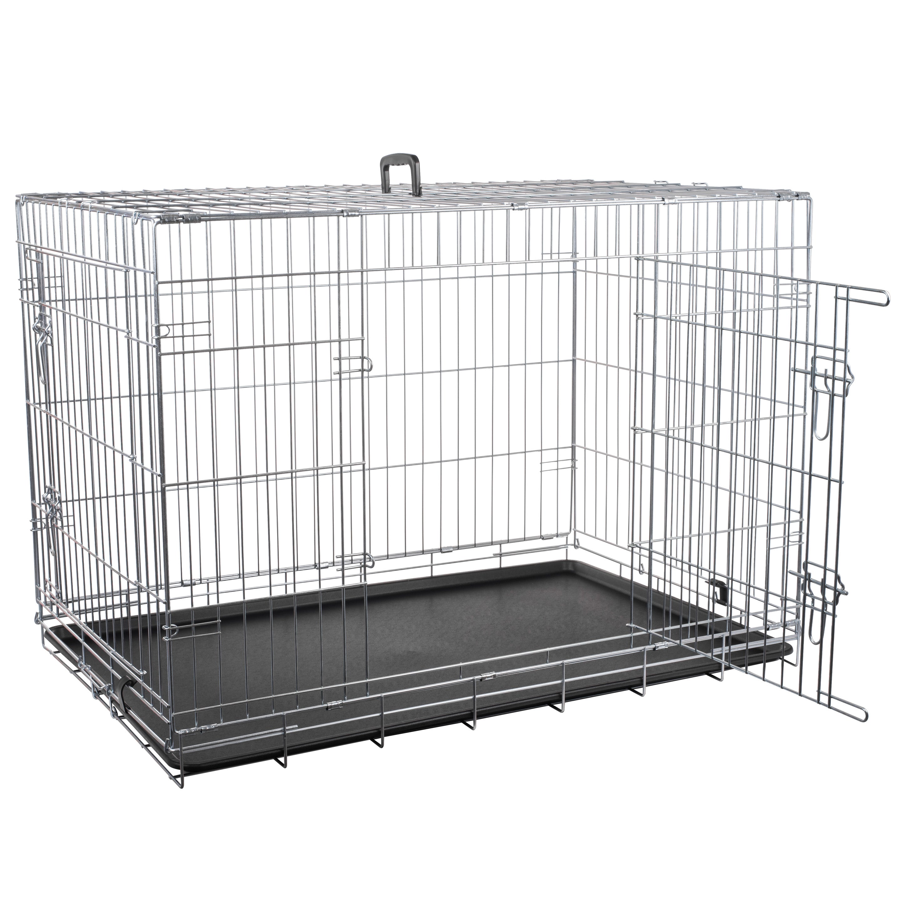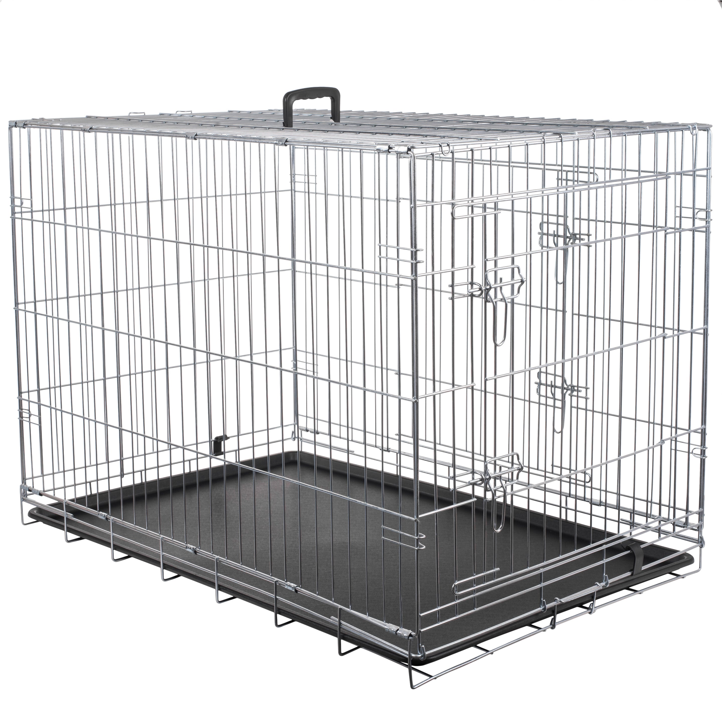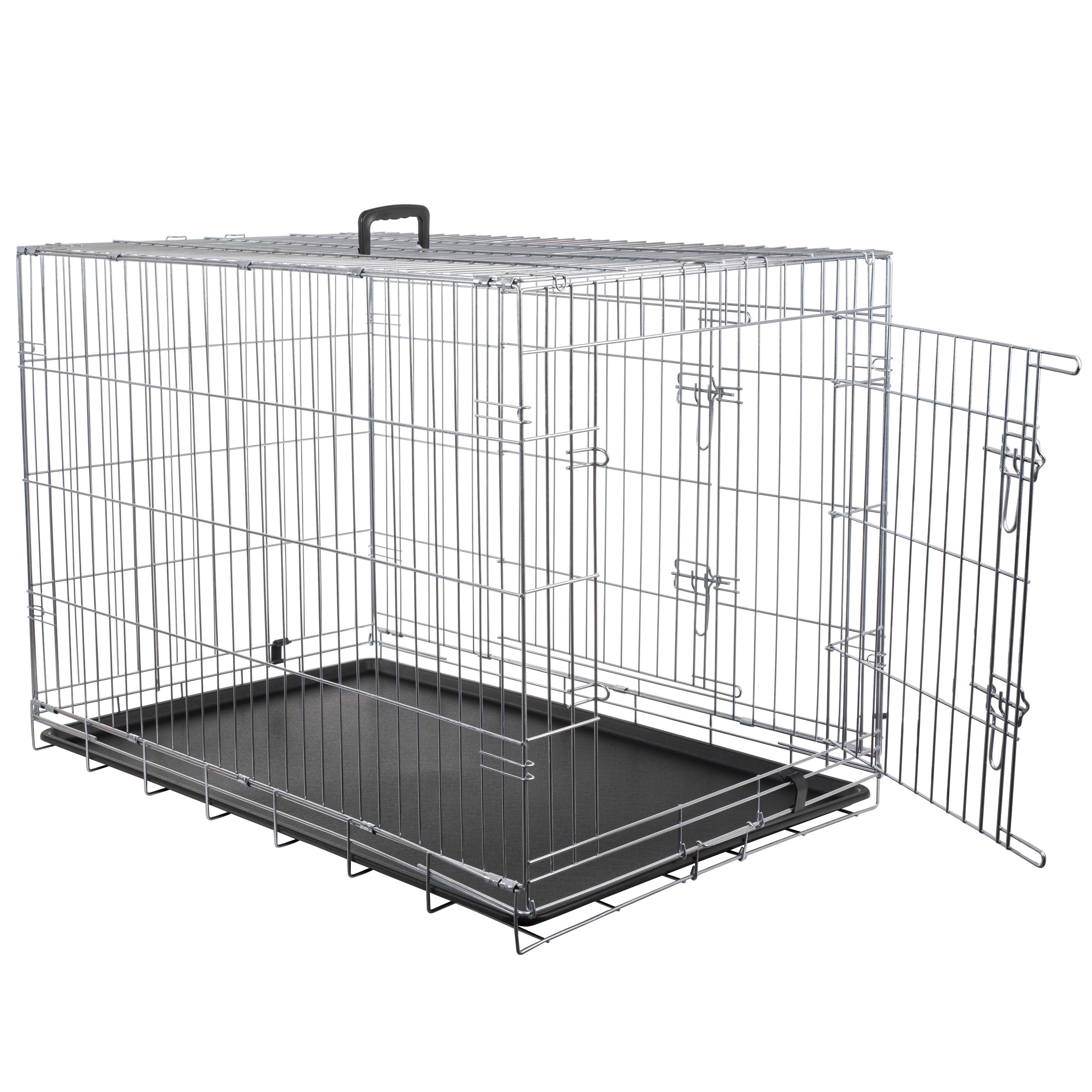 The kennel is constructed from 3 to 4.8 mm thick wire. For corrosion protection, the cage is made from galvanized wire. The cage size is suitable for large dogs.
