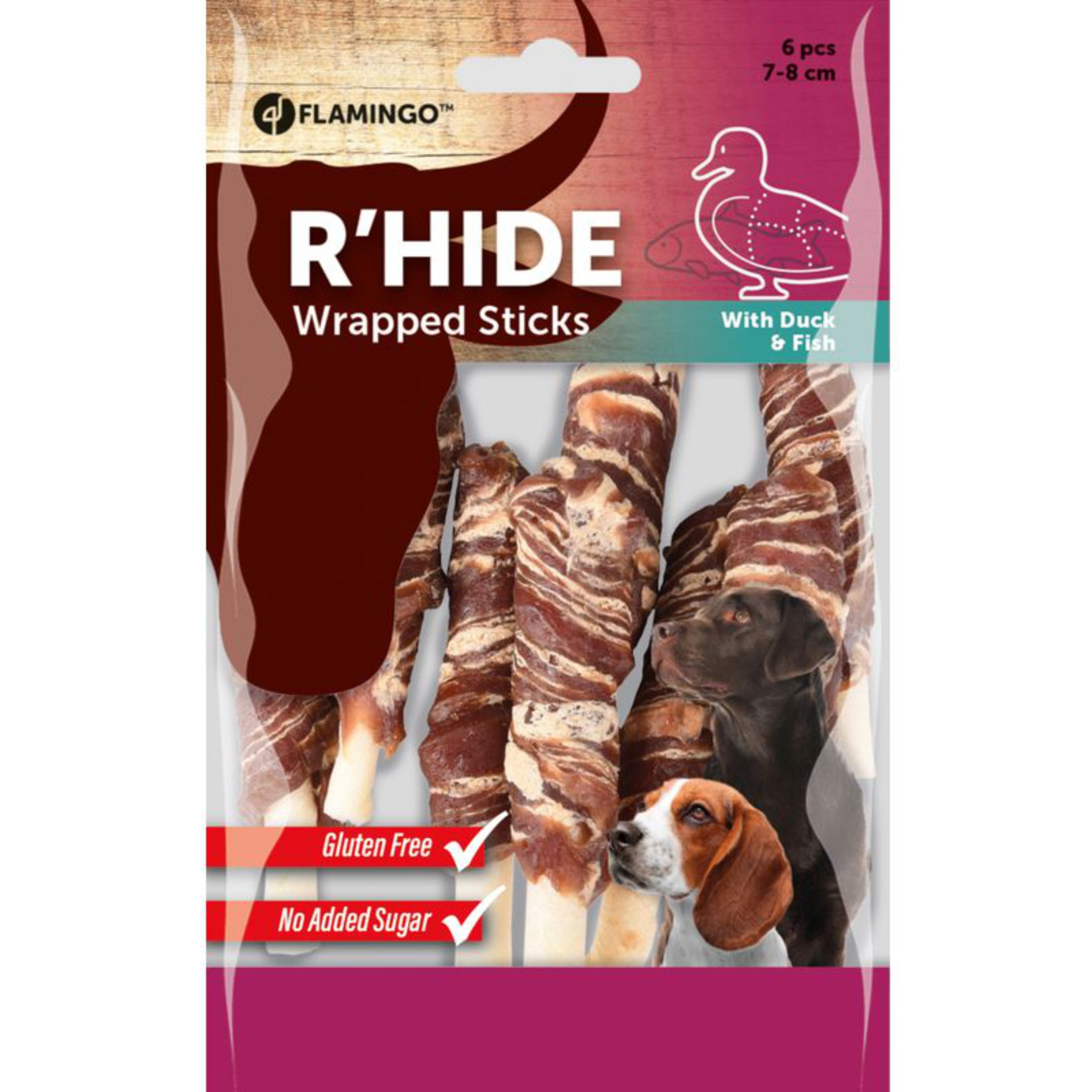 Flamingo R'hide Wrapped Sticks are delicious dog treats made with duck meat and cod, perfect for dogs over 6 months of age.