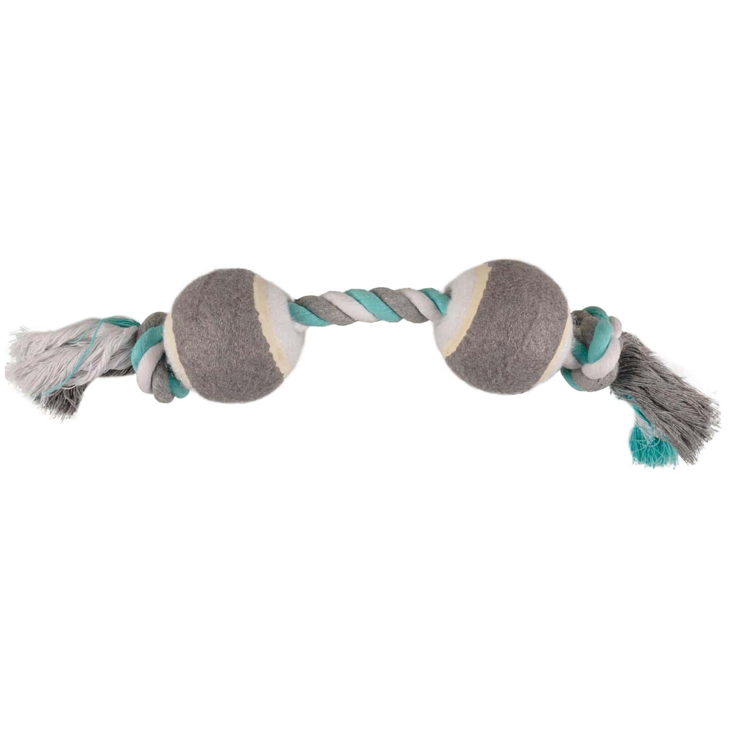 The Flamingo Duotennis Rope is a toy perfect for active play with your beloved four-legged friend. If your dog is the type that constantly chases balls and loves all sorts of tussles, they'll definitely love this product. The toy is shaped like a dumbbell: two tennis balls are attached to a string woven from strong cotton thread. Knots at the ends of the rope prevent the balls from slipping and make it easier to grab the tug. The toy is available in two colors: pink and mint.