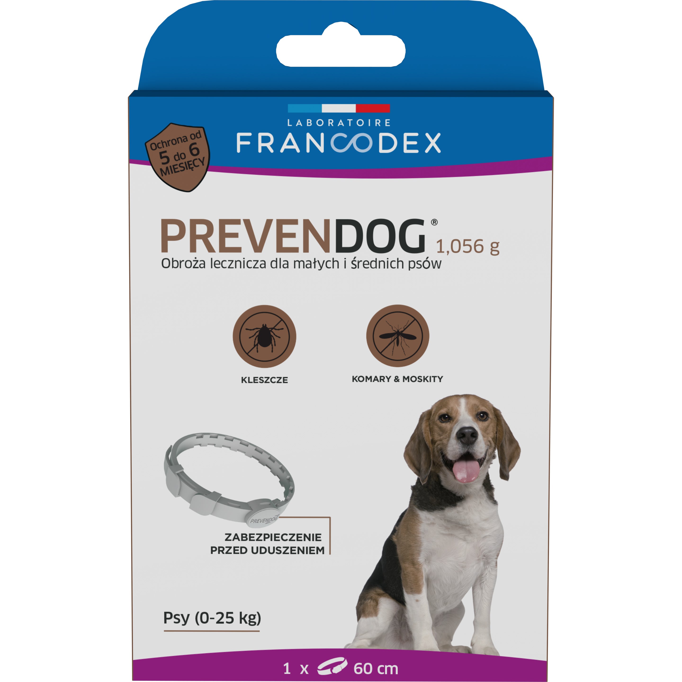 Prevendog 1.056g Medicated Tick and Mosquito Collar for Dogs prevents tick infestations and repels mosquitoes and sandflies for small and medium-sized breeds.
