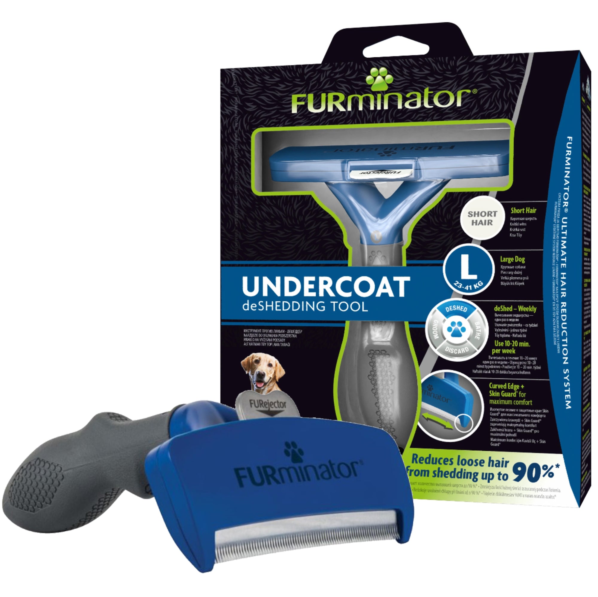 The FURminator deShedding Tool is designed for medium-breed dogs weighing 23 to 41 kg with hair less than 5 cm long, such as Labrador Retrievers, Dalmatians, and German Shepherds. It makes the deShedding process less troublesome, leaving your pet's coat looking healthy and beautiful.