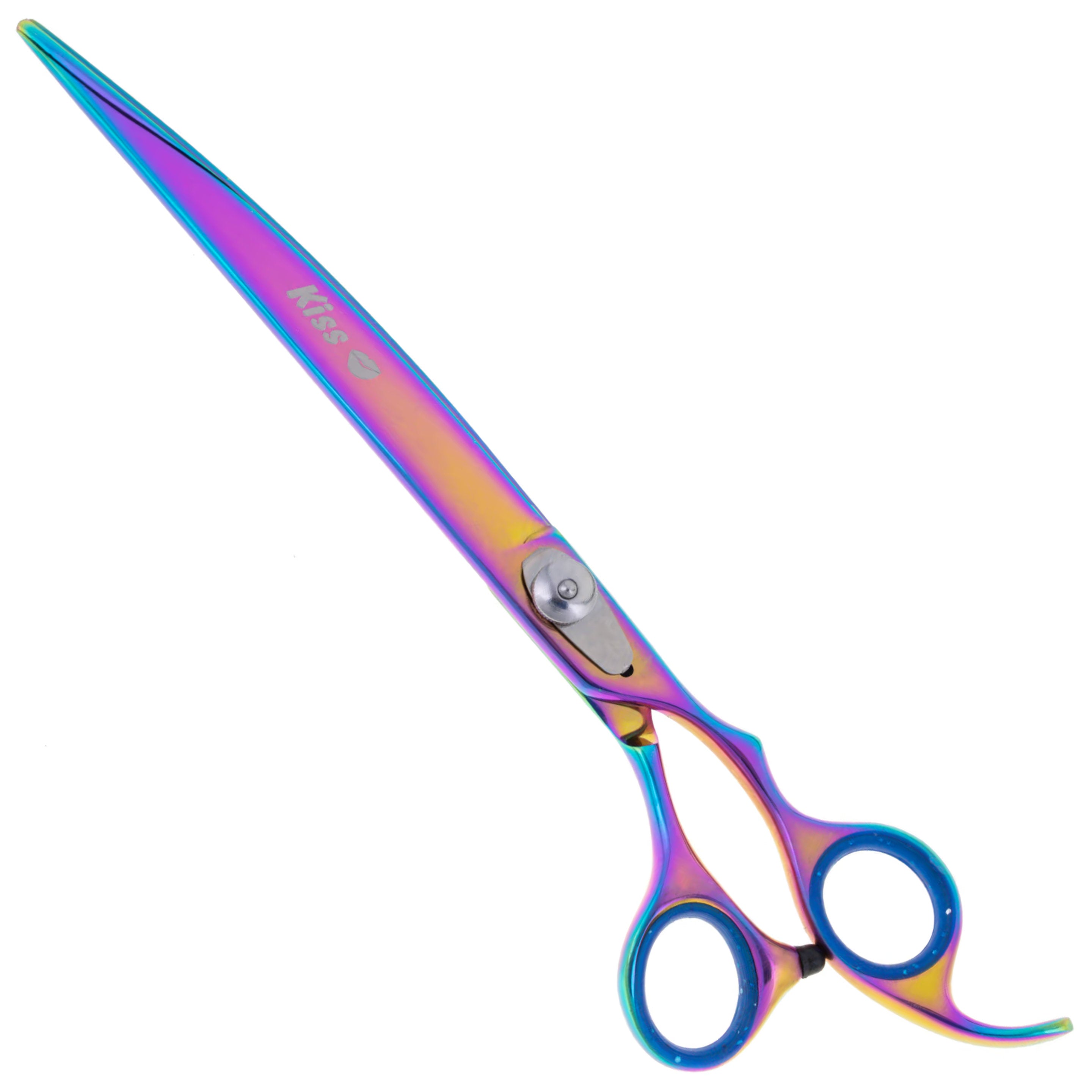 High-quality curved scissors with a beautiful rainbow finish, perfect for circular trimming and suitable for all coat types.