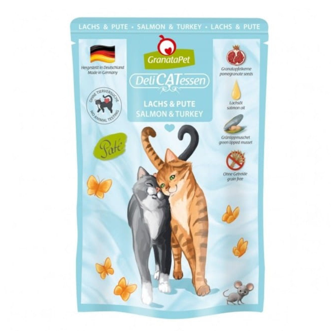 GranataPet DeliCatessen Salmon & Turkey wet cat food is made from the highest quality ingredients. Only muscle meat and high-quality offal (e.g., hearts, liver, stomachs) are used. No byproducts such as blood, claws, bones, beaks, or feathers are used, nor are any fillers or meat substitutes added. It's enriched with valuable additives such as pomegranate seeds, high-quality oils (linseed, salmon), green-lipped mussels, and taurine. These enhance the nutritional value and palatability of the meal. The food is manufactured in Germany with full traceability of ingredients at every stage of the production process. Raw materials are sourced from trusted and proven suppliers, subject to full veterinary inspection, and tested by internal and external laboratories. GranataPet food is prepared using a gentle steaming method to preserve as much nutritional value as possible. Rich in valuable protein, it's easily digestible and completely grain-free. It also contains no sugar, artificial preservatives, colors, flavor enhancers, or GMOs.