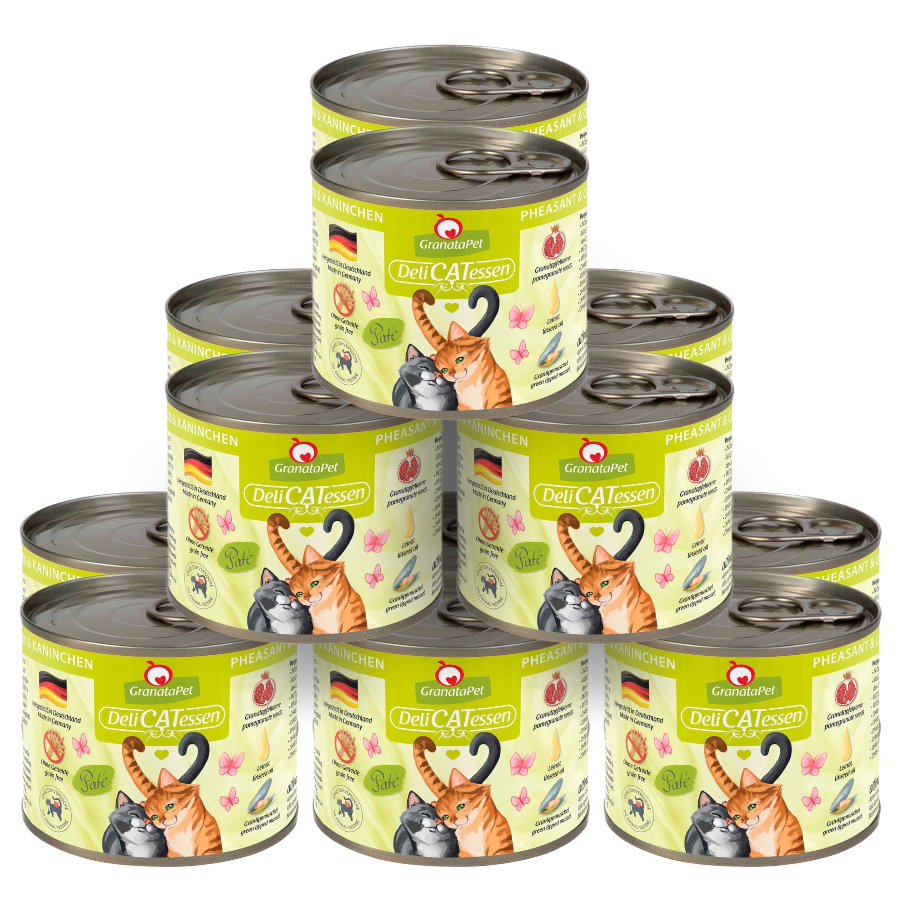 GranataPet DeliCatessen Pheasant & Coney Pheasant with Rabbit wet cat food is made from the highest quality ingredients. Only muscle meat and high-quality offal (e.g., hearts, liver, stomachs) are used. No byproducts such as blood, claws, bones, beaks, or feathers are used, nor are any fillers or meat substitutes added. It is enriched with valuable additives such as pomegranate seeds, high-quality oils (linseed, salmon), green-lipped mussel, and taurine. These enhance the nutritional value and palatability of the meal.
