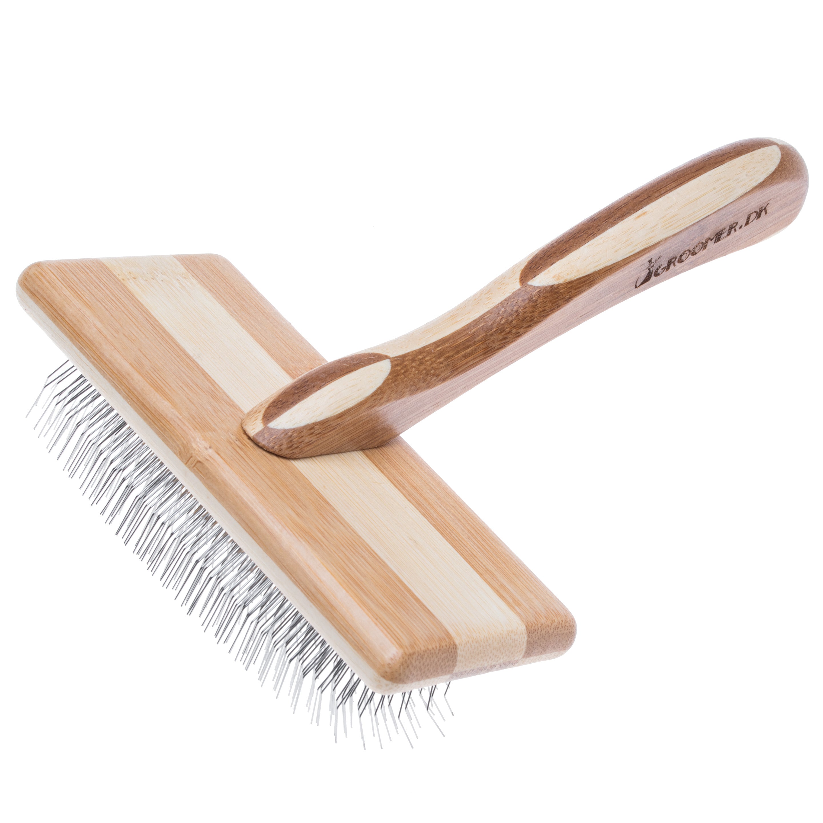 A high-quality, original poodle brush from the Danish brand Groomer.dk. Handmade with attention to every detail, it was designed by Katerine Cechová and Pie Nissen, breeders of miniature schnauzers. This brush is ideal for detangling thick, dense hair, removing knots and removing hard-to-reach undercoat. It can also be used while drying to fluff up the coat. Thanks to its long pins (2 cm), it penetrates even the thickest coat, right down to the skin. It lifts the hair without damaging or pulling the fur, as the air cushion is soft and the pin is gentle. This is an essential tool for those looking for something special.