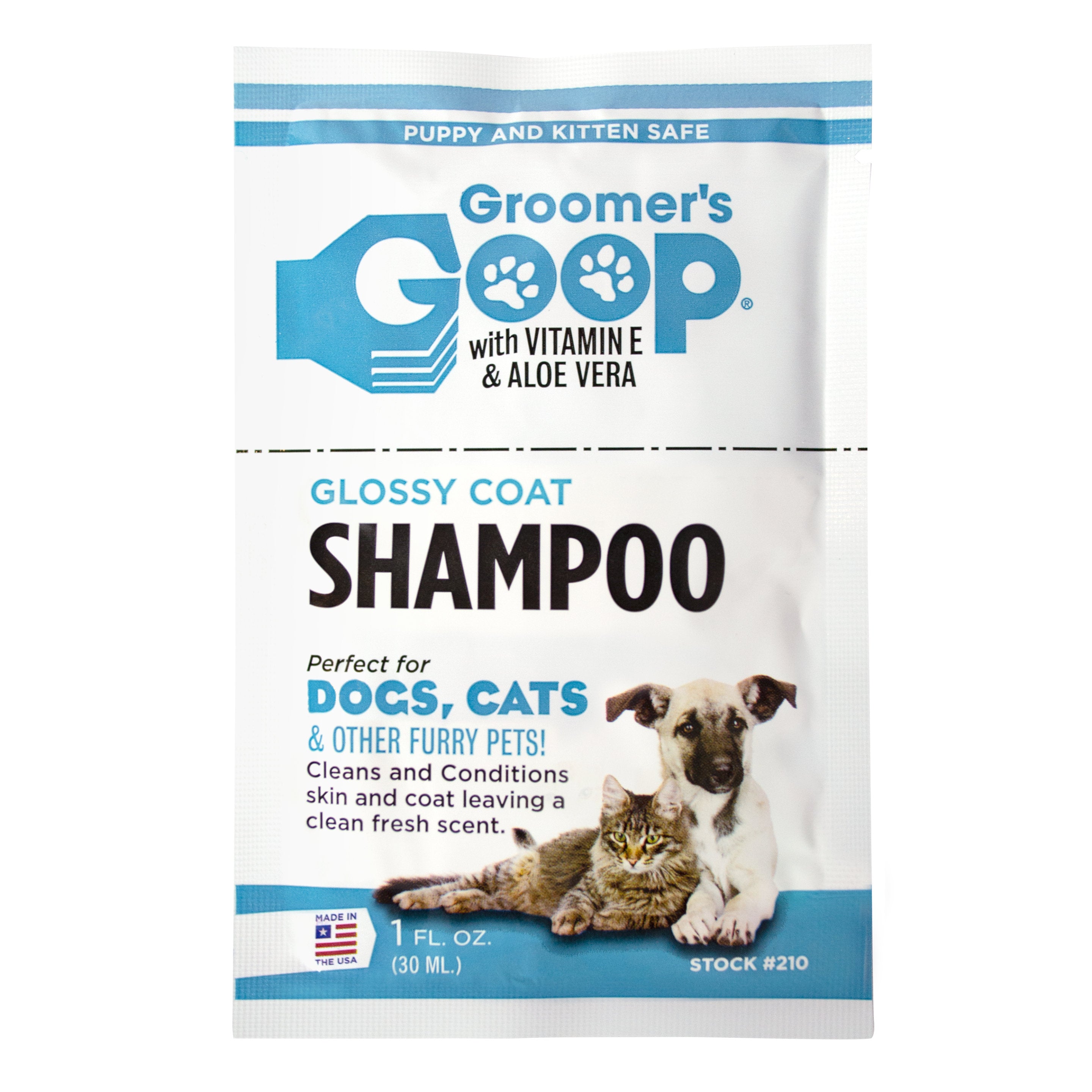 Groomer's Goop Glossy Coat Shampoo for dogs and cats thoroughly cleanses and cares for your pet's coat, using natural ingredients like aloe vera and vitamin E to prevent irritation and dryness.