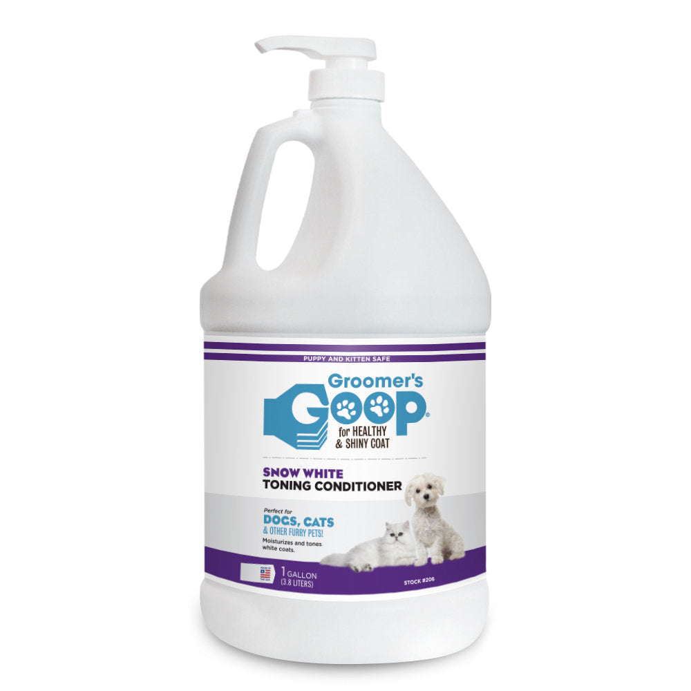 Groomer's Goop Snow White Toning Conditioner for dogs and cats restores the shine of white and light coats while being safe for skin and coat.