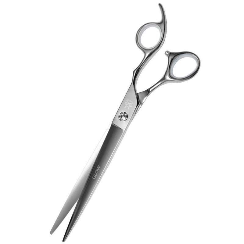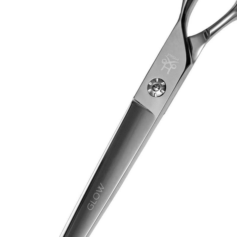 Professional straight scissors Hydra, Glow model with Convex blade. Made from high-quality Japanese stainless steel with a hardness of 57 HRC. Perfectly balanced, they fit perfectly in the hand, ensuring high comfort of use. The ergonomic, asymmetric handle guarantees comfortable work. They have a fixed finger rest and a precise adjustment screw mounted on Japanese bearings.