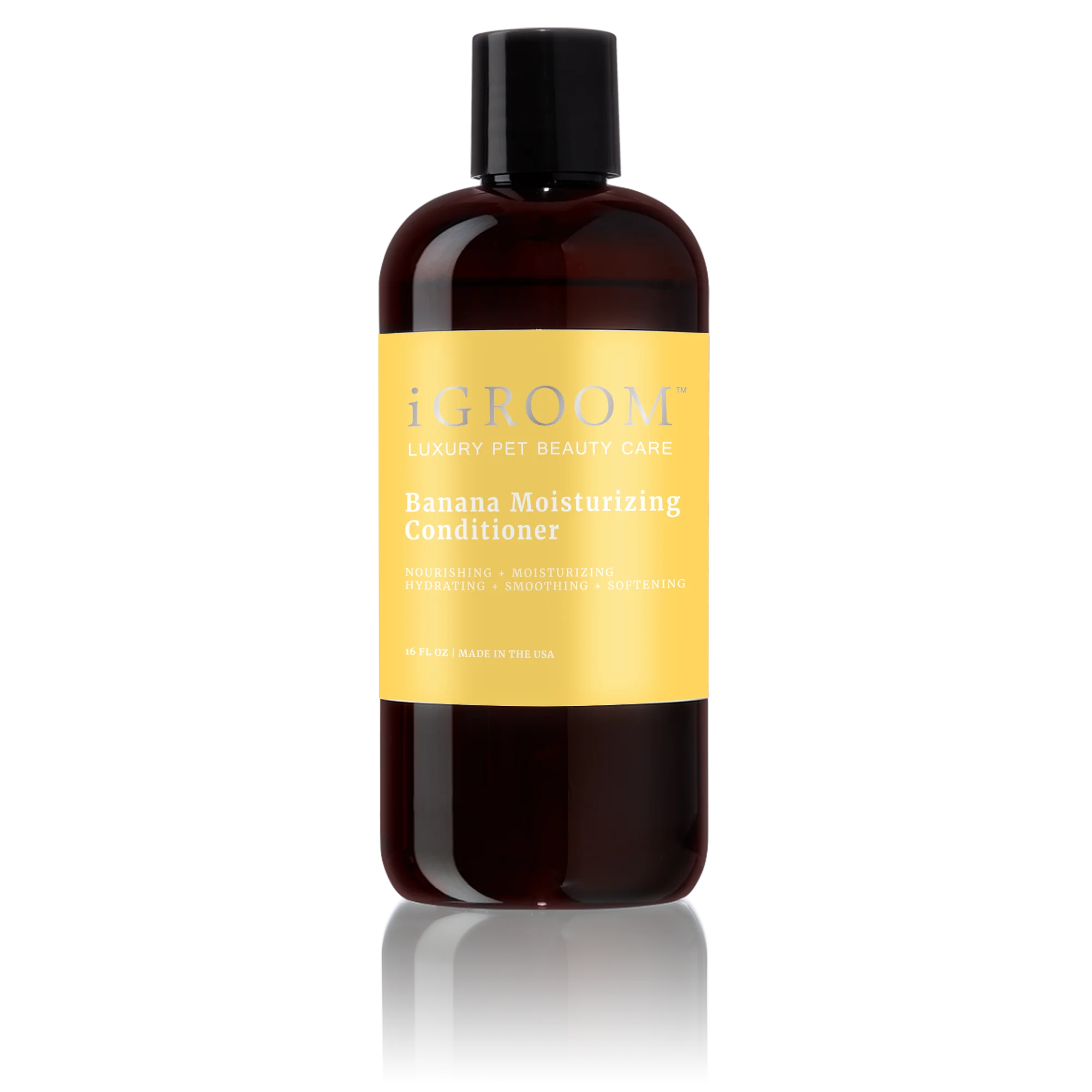 iGroom Banana Moisturizing Conditioner is formulated with nutrient-rich banana extract to help repair dry and damaged coats, leaving them silky, soft, and shiny.