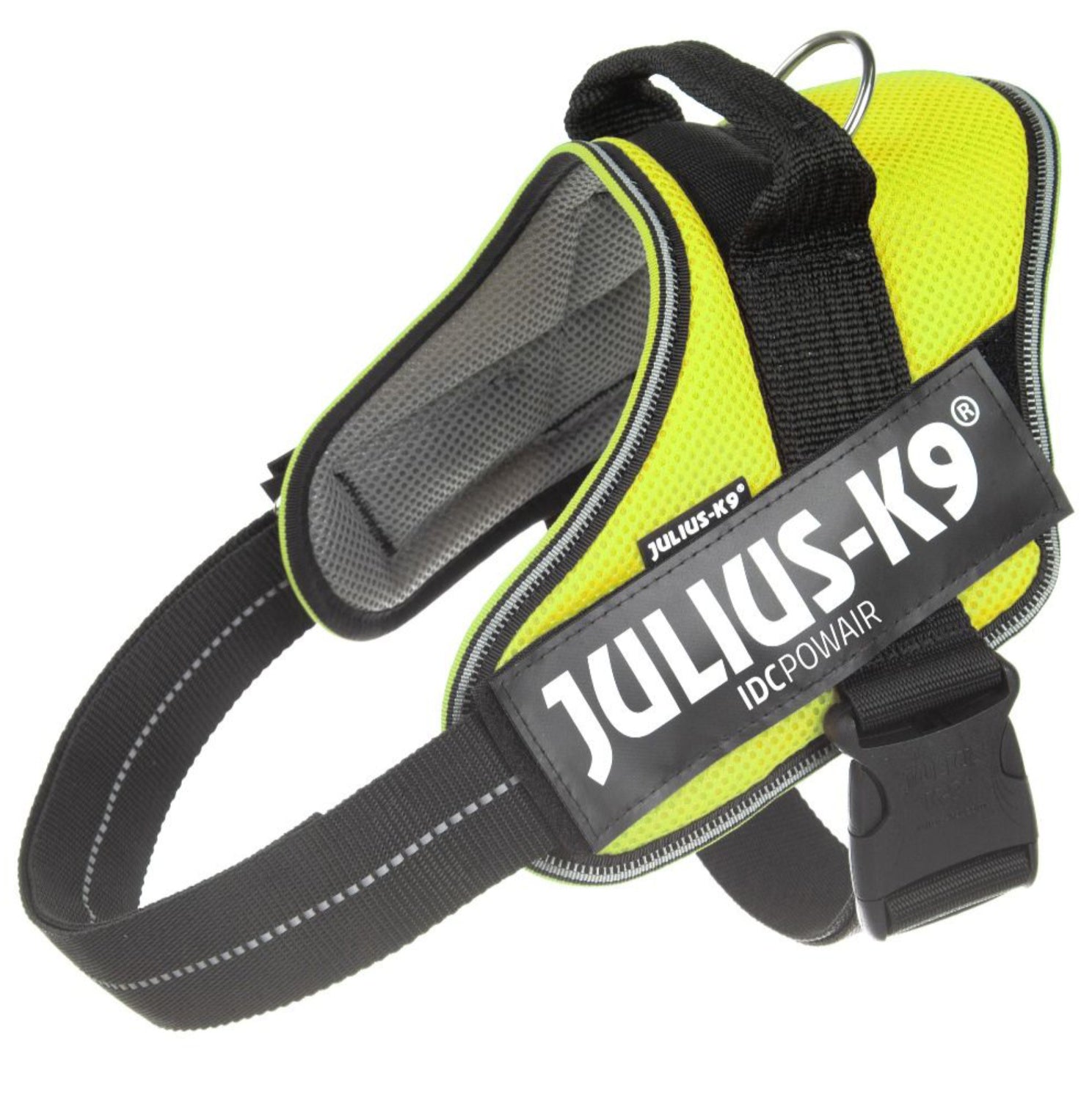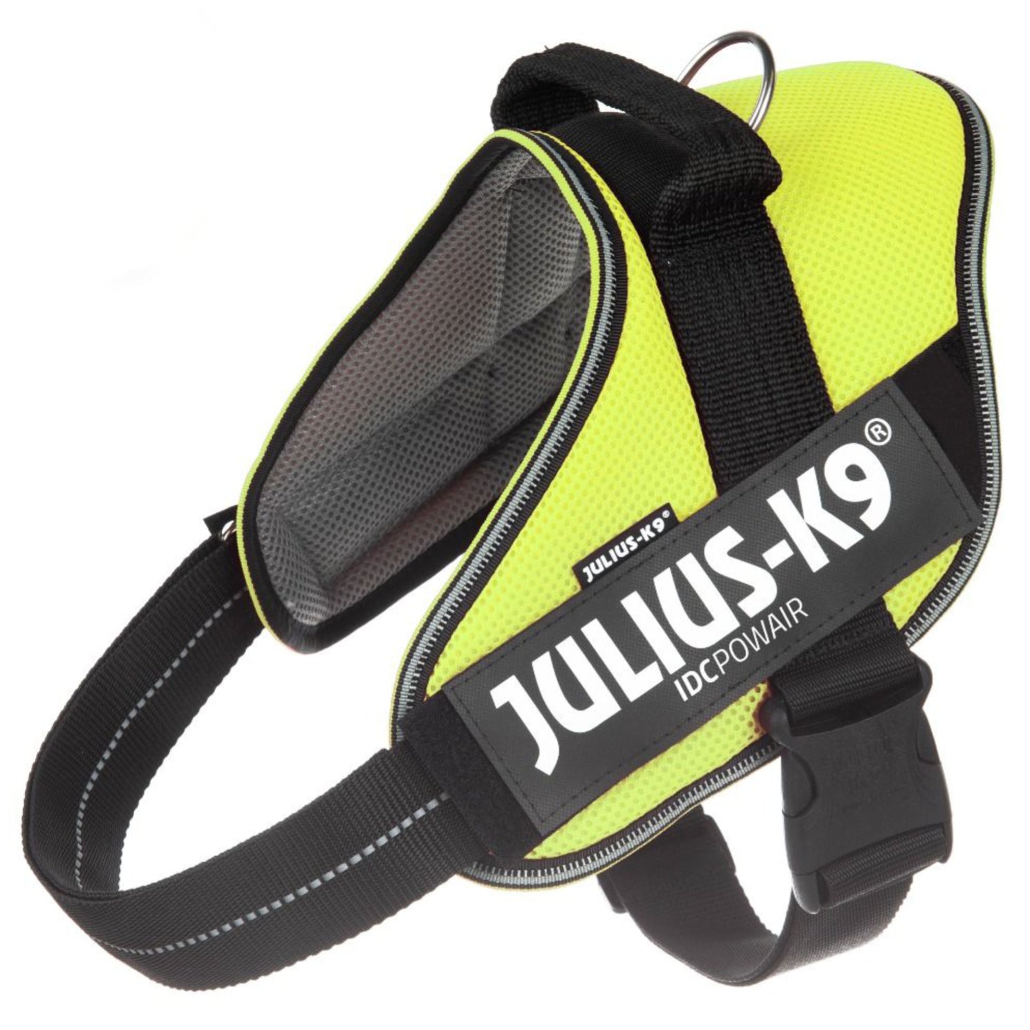 The Julius K9 IDC Powair harness is a lightweight, breathable dog harness designed for comfort and safety, featuring reflective elements and a strong metal O-ring for leash attachment.