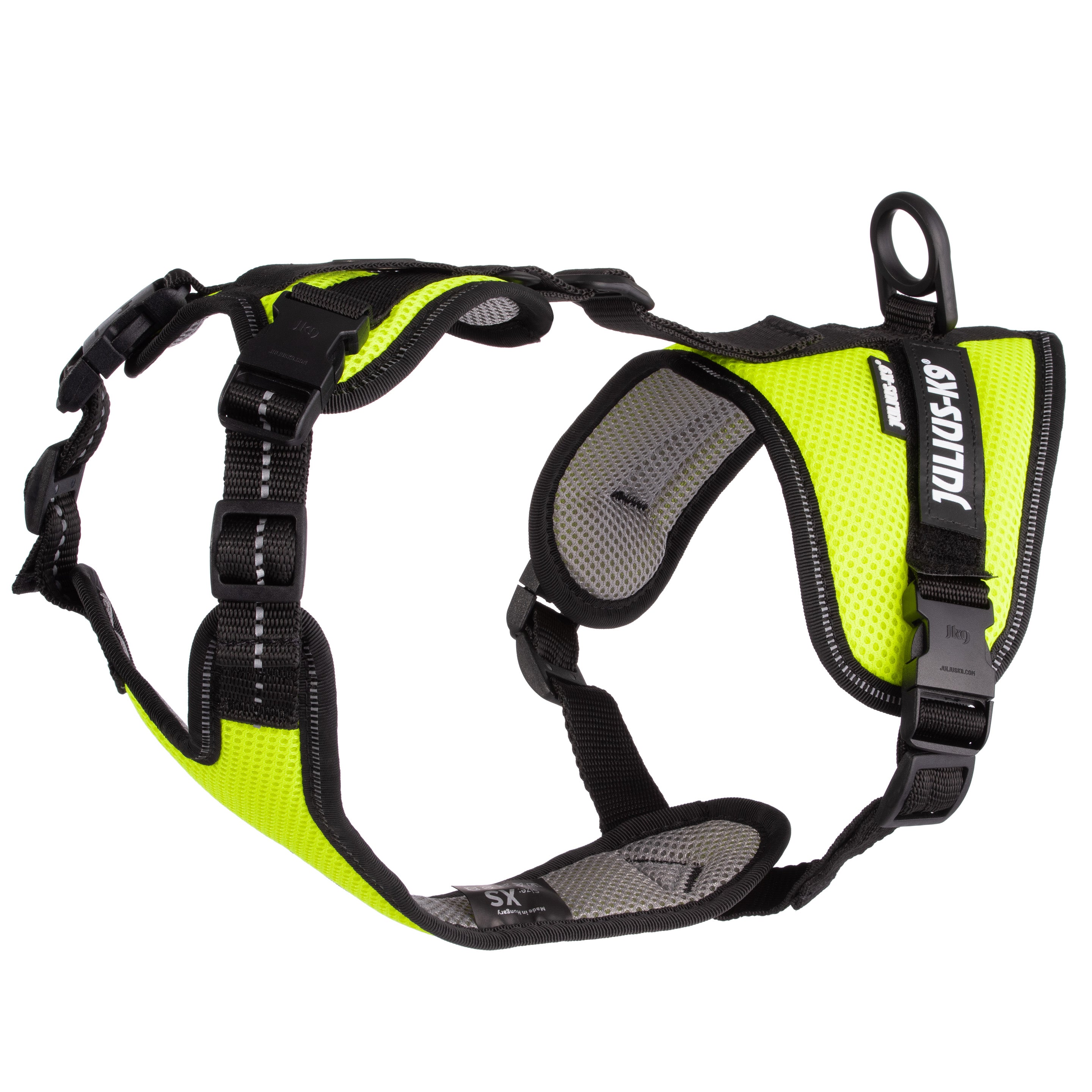 The Julius-K9 Mantrailing Air Mesh Harness is a dog harness designed for tracking dogs. Developed in collaboration with mantrailing professionals, this model is especially recommended for beginners. The harness's construction allows for a precise fit to the dog's body (adjustable at up to 5 points). It consists of three independent parts made of double, breathable Air Mesh and connected by straps. This design allows the harness to dynamically adapt to the animal, providing it with complete freedom of movement. The double Air Mesh, with a sponge-like structure, provides excellent body ventilation, giving the harness a soft and lightweight feel. Neon color and reflective accents guarantee high visibility. The fasteners and adjustment elements are made of technologically advanced plastics and subjected to multiple durability tests. The straps come from reputable German factories, and the textile components are OEKO-TEX certified.