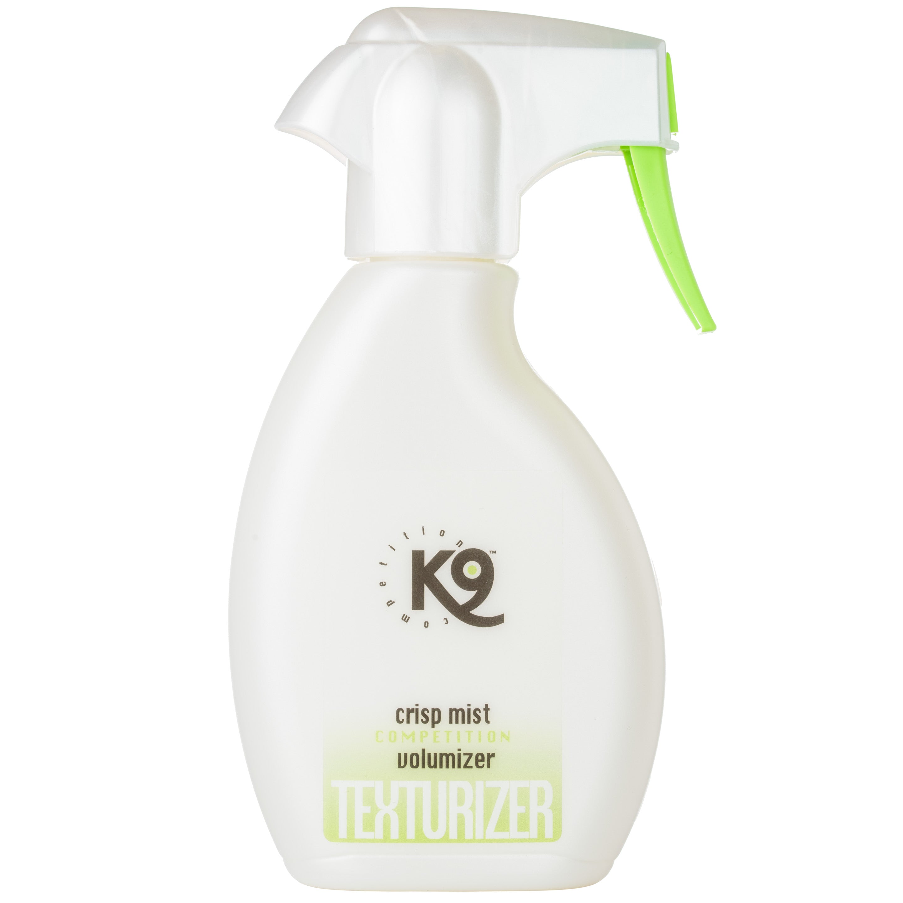 K9 Crisp Mist Texturizer is a safe, alcohol-free spray that adds texture and volume to the coats of dogs and cats, enriched with natural ingredients like aloe vera and provitamin B5.