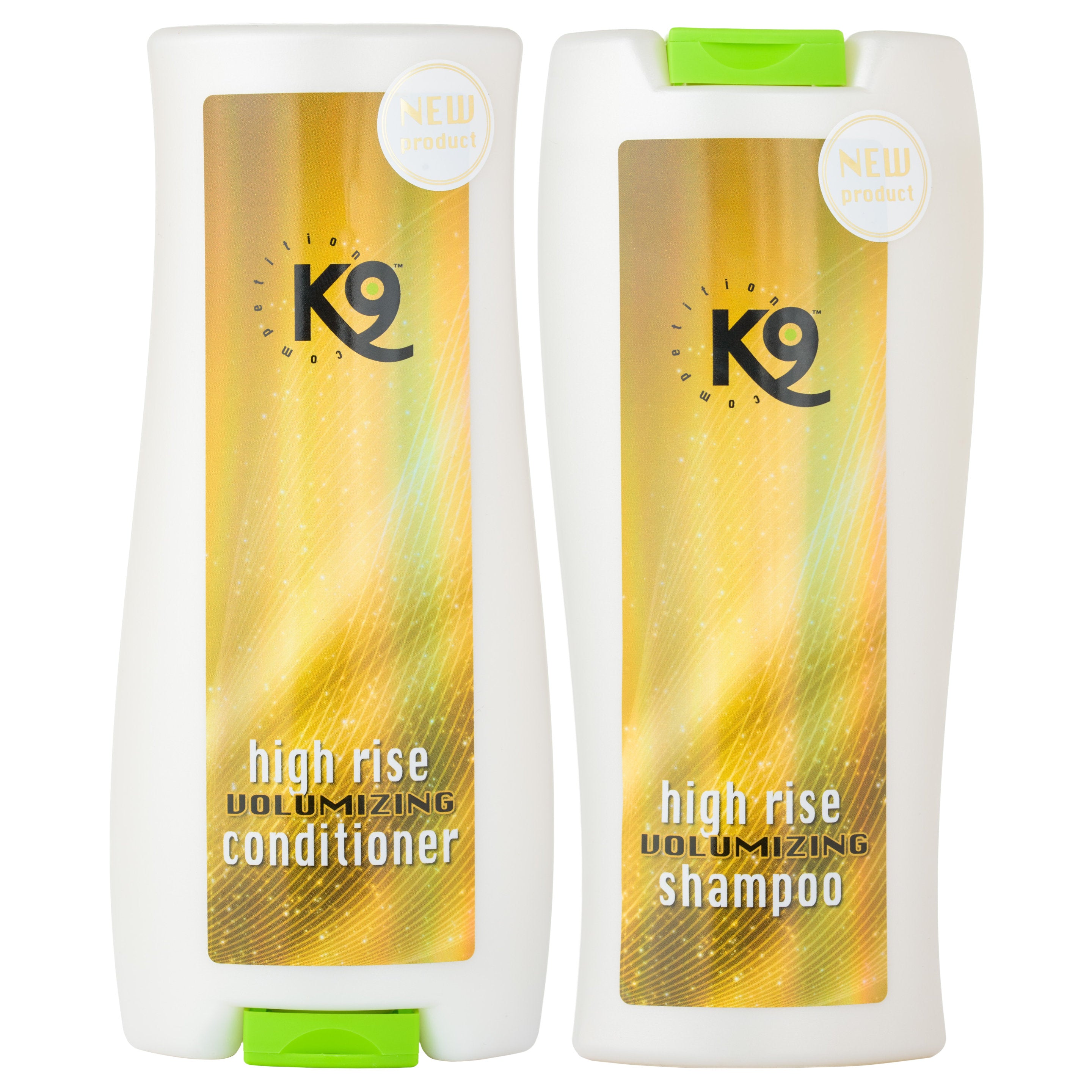 The K9 High Rise Volumizing Set includes a shampoo and conditioner designed to enhance the volume of your pet's coat. These products are suitable for dogs, cats, and other pets, making them ideal for use at home or in a grooming salon.