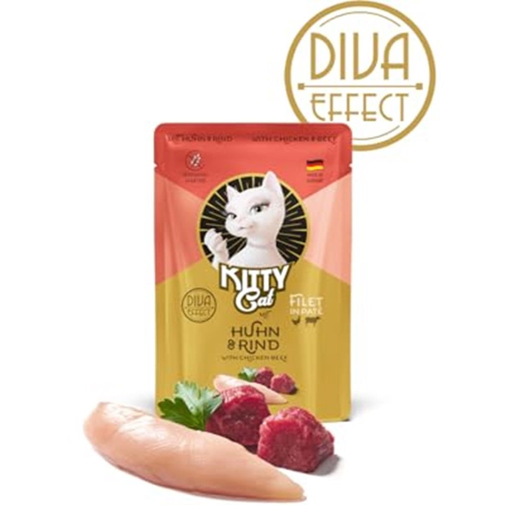 Discover our exceptional wet cat food in pouches: Kitty Cat Filet in Pate with Chicken & Beef. Chicken and beef fillets in a soft pate. This fully balanced meal will provide your four-legged friend with all the nutrients they need to stay healthy and happy. This food contains only the best ingredients, specially formulated to ensure your pet's health and beauty. It will give you a look of trust, love, and satisfaction from your four-legged friend.