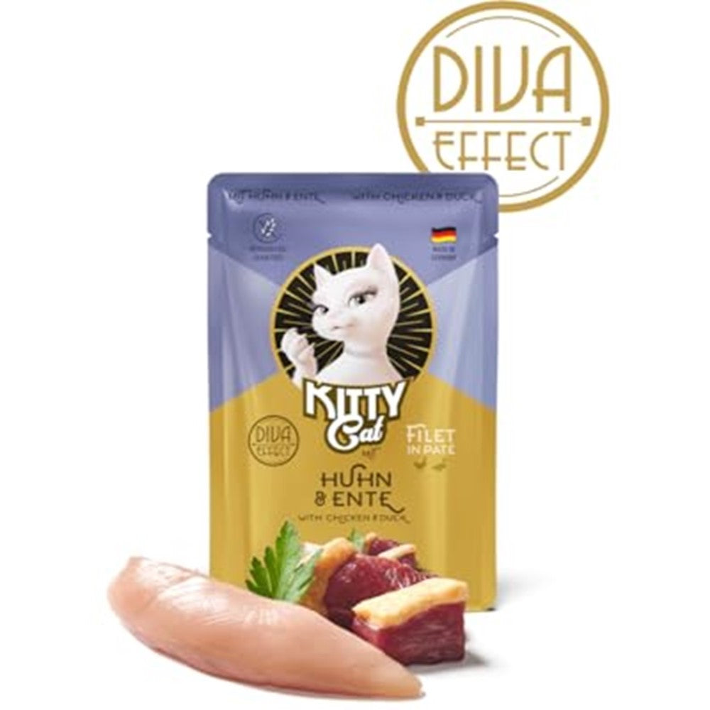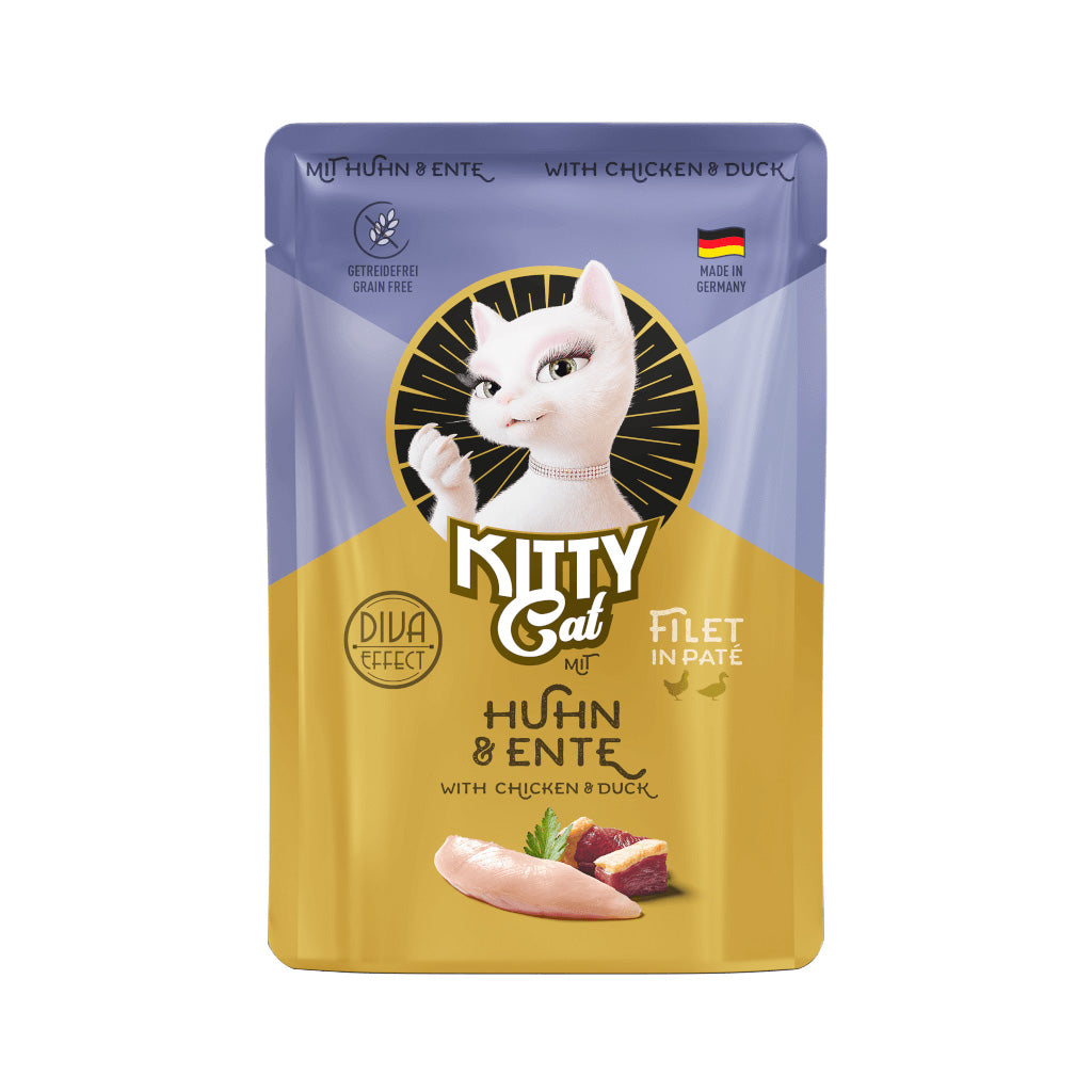 Discover the exceptional Kitty Cat Filet in Pate with Chicken & Duck, a fully balanced wet cat food made in Germany to provide your pet with all the nutrients they need for health and beauty.